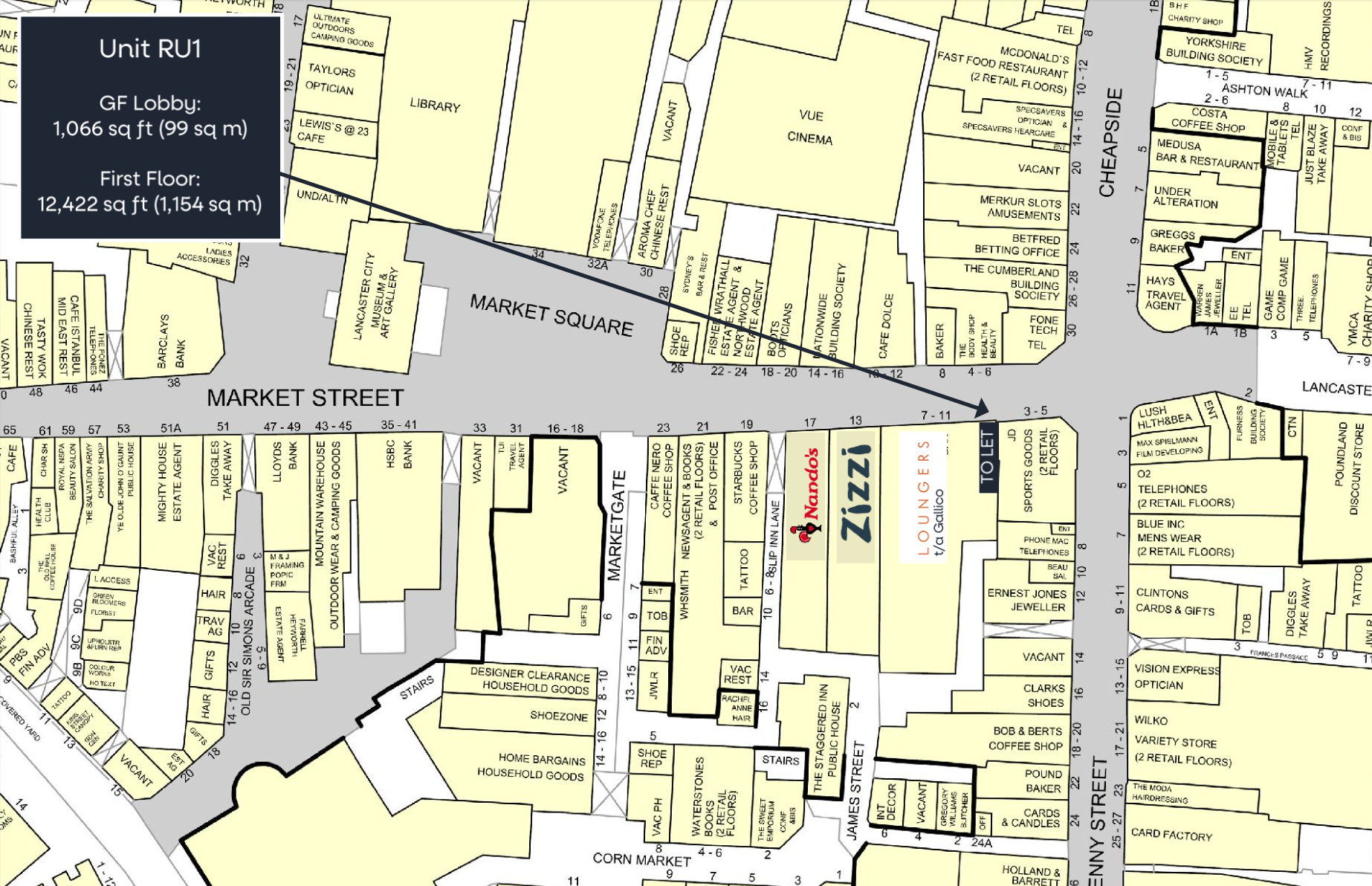 The property occupies a prime trading location on the pedestrianised section of Market Street between Penny Street and the entrance to the Marketgate Shopping Centre, and opposite the VUE Cinema .