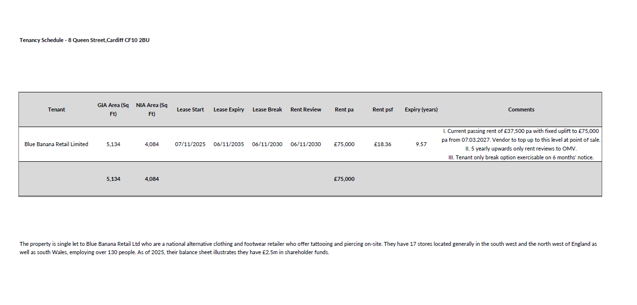 The property occupies a mid-terrace position fronting Queen Street, Cardiff’s prime pedestrianised retail destination. Queen Street benefits from exceptionally high footfall, drawing from both local residents and visitors as well as Cardiff’s significant student population and is home to leading national retailers including M&S, Matalan, Boots, Next and JD Sports, with the St David’s Shopping Centre (anchored by John Lewis) situated nearby.