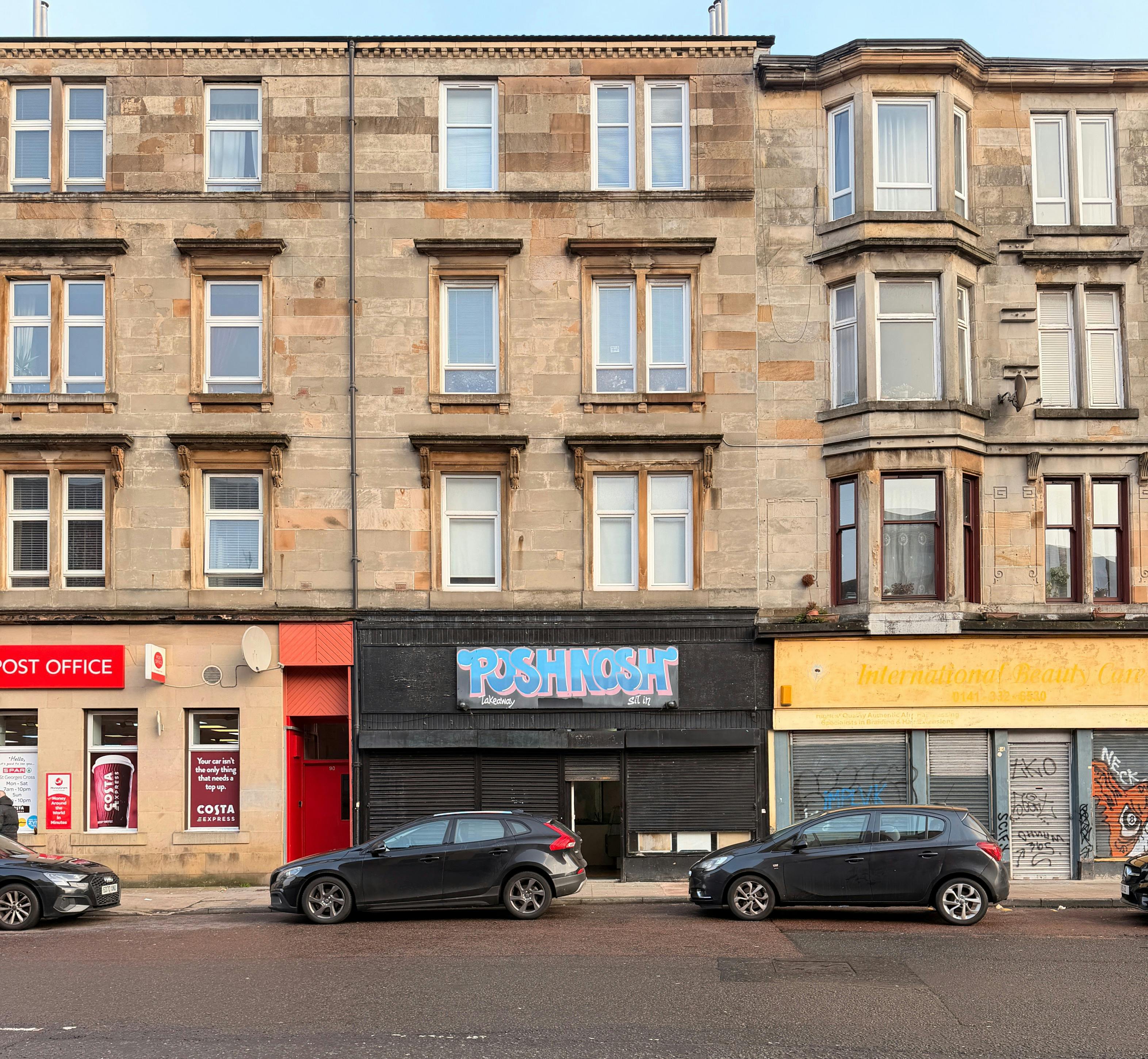 The subjects comprise a twin ground floor retail unit within a blonde sandstone tenement building, under a pitched and tiled roof. The building is arranged over four floors providing residential space on the upper floors.
