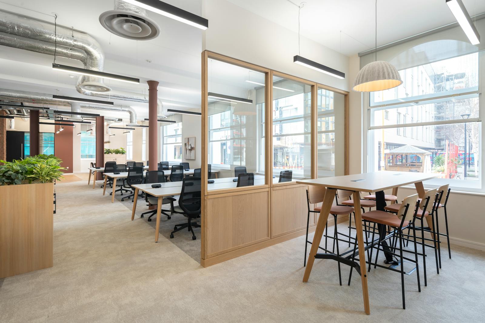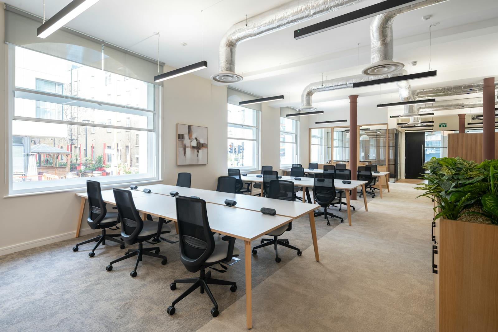 The Raised Ground & 1st Floor offices have undergone a comprehensive refurbishment. Each floor will be fully fitted to comprise 30 desks, a 12-person meeting room, 4-person meeting room, hotdesking, a waiting/reception area, large kitchen & breakout, collaboration areas and phone booths.