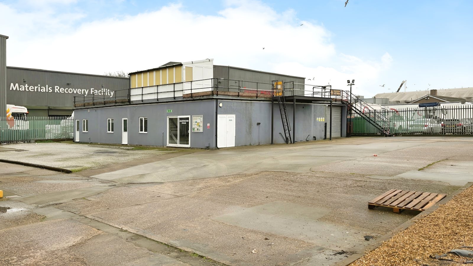 The site comprises of secure palisade fencing to all boundaries with double entrance gates, offices, stores, a concrete surfaced open yard and parking areas.
