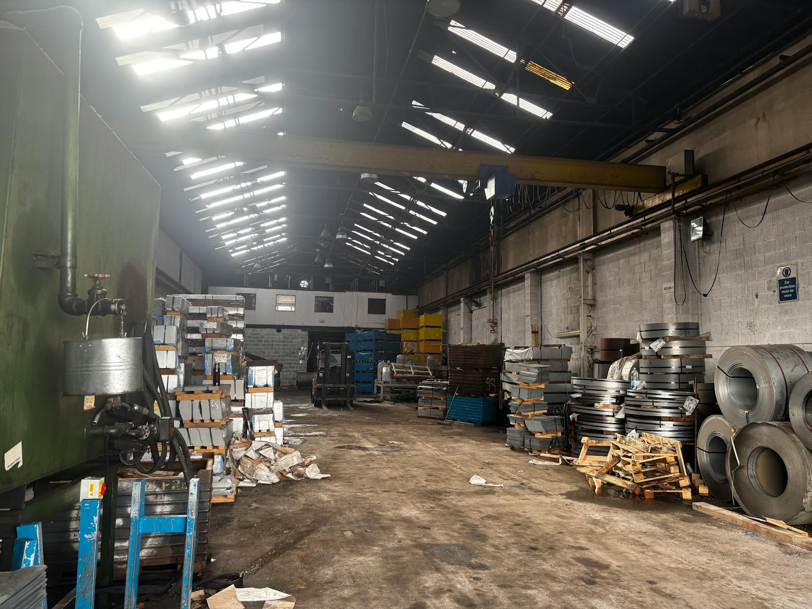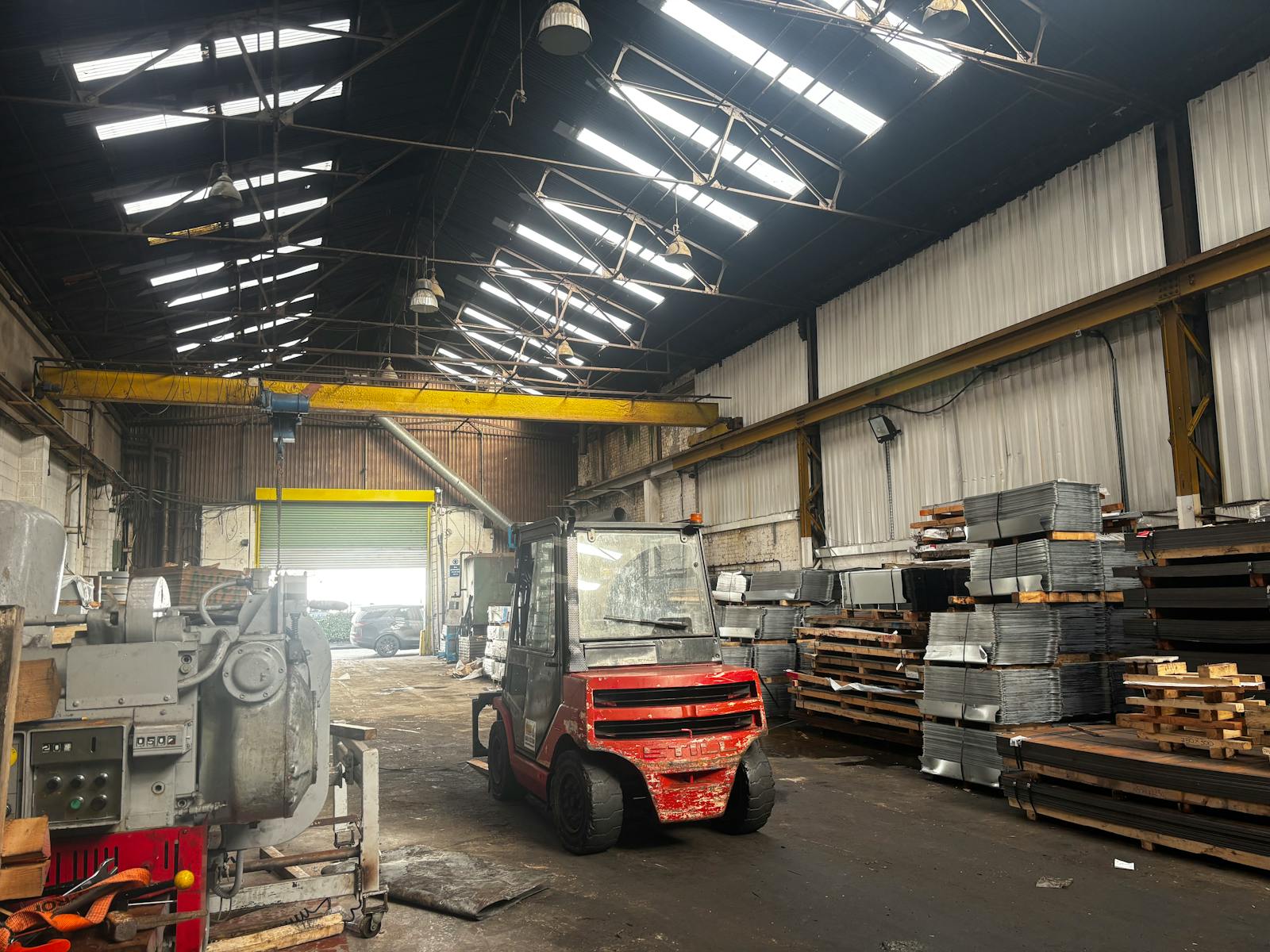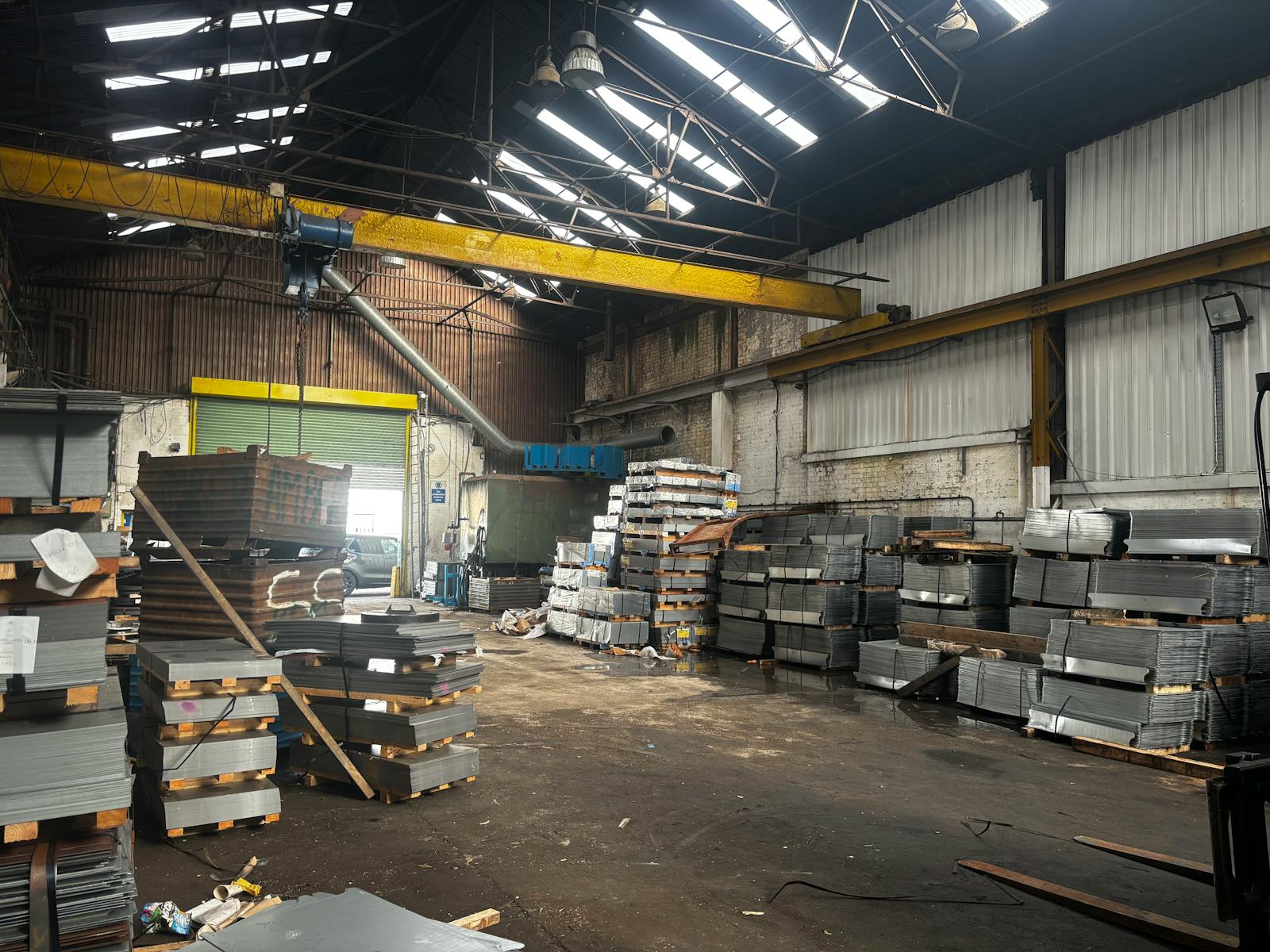 The warehouse accommodation benefits from concrete flooring, high bay sodium lighting, three phase power, and a minimum eaves height of 23ft 9” rising to 32ft 6”in the apex.