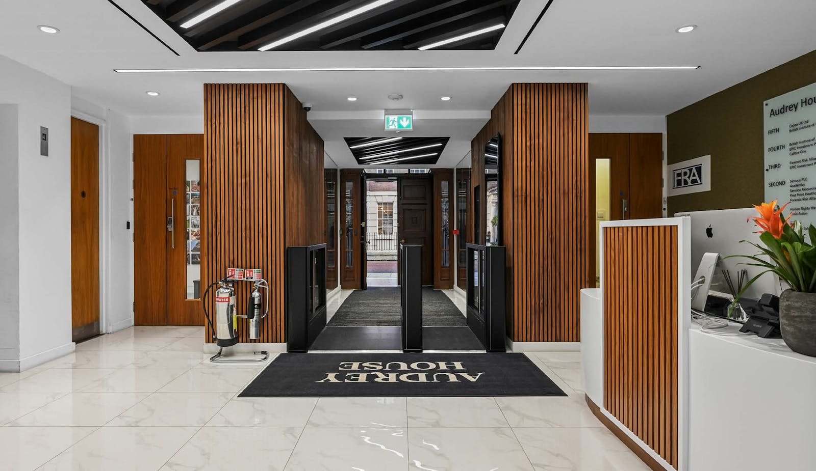 Audrey House is a grand & prominent building on Ely Place, situated adjacent to the historic St. Etheldred’s Crypt. There is a new reception, commissionaire, passenger lifts and (new) extensive end of journey facilities including bike racks and luxurious showers.