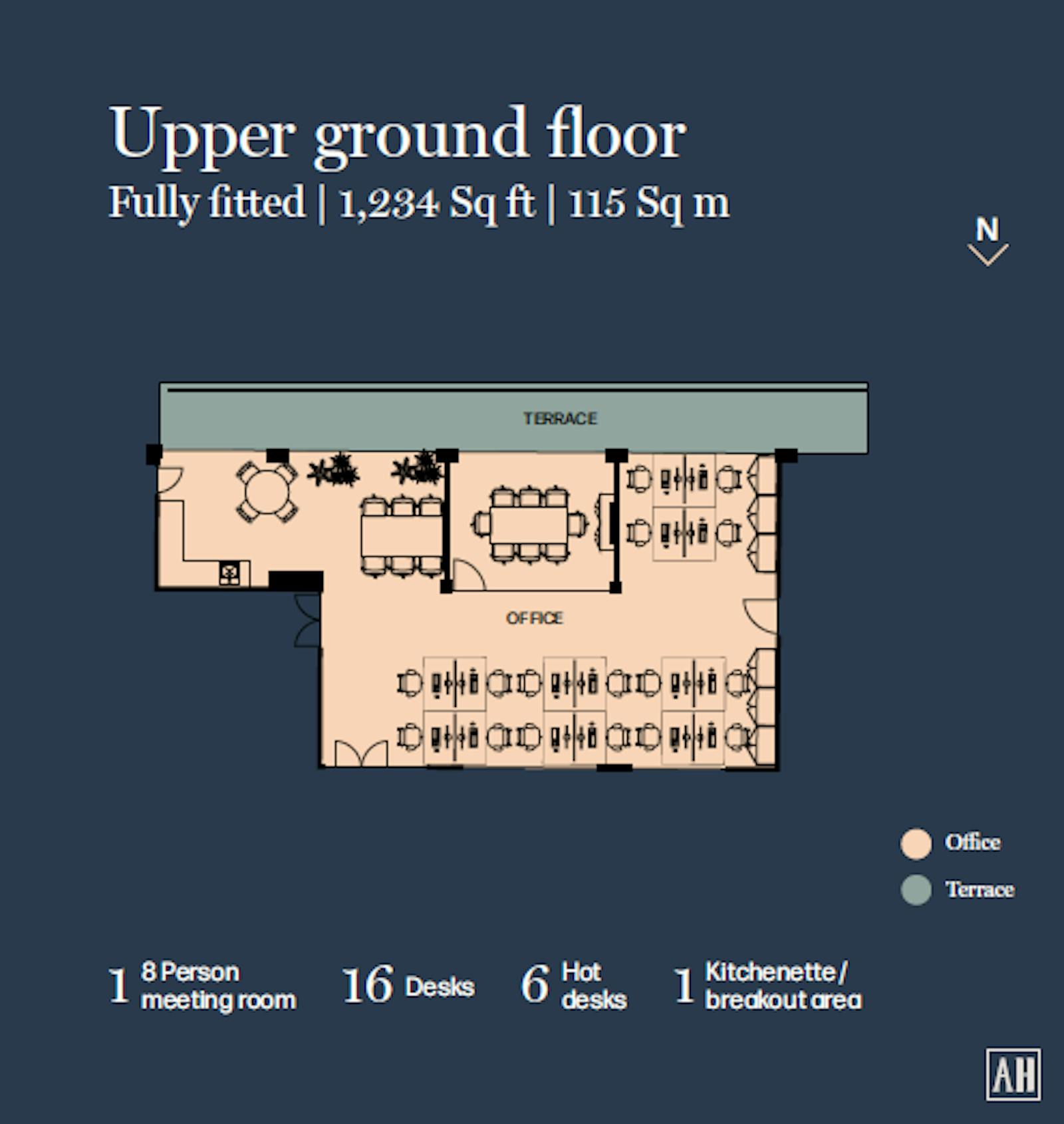 The office space is available on the Ground and Garden floor. The part ground floor has been fitted out for immediate occupation with 16 open plan workstations, break-out space, kitchenette and an 8-person meeting room.