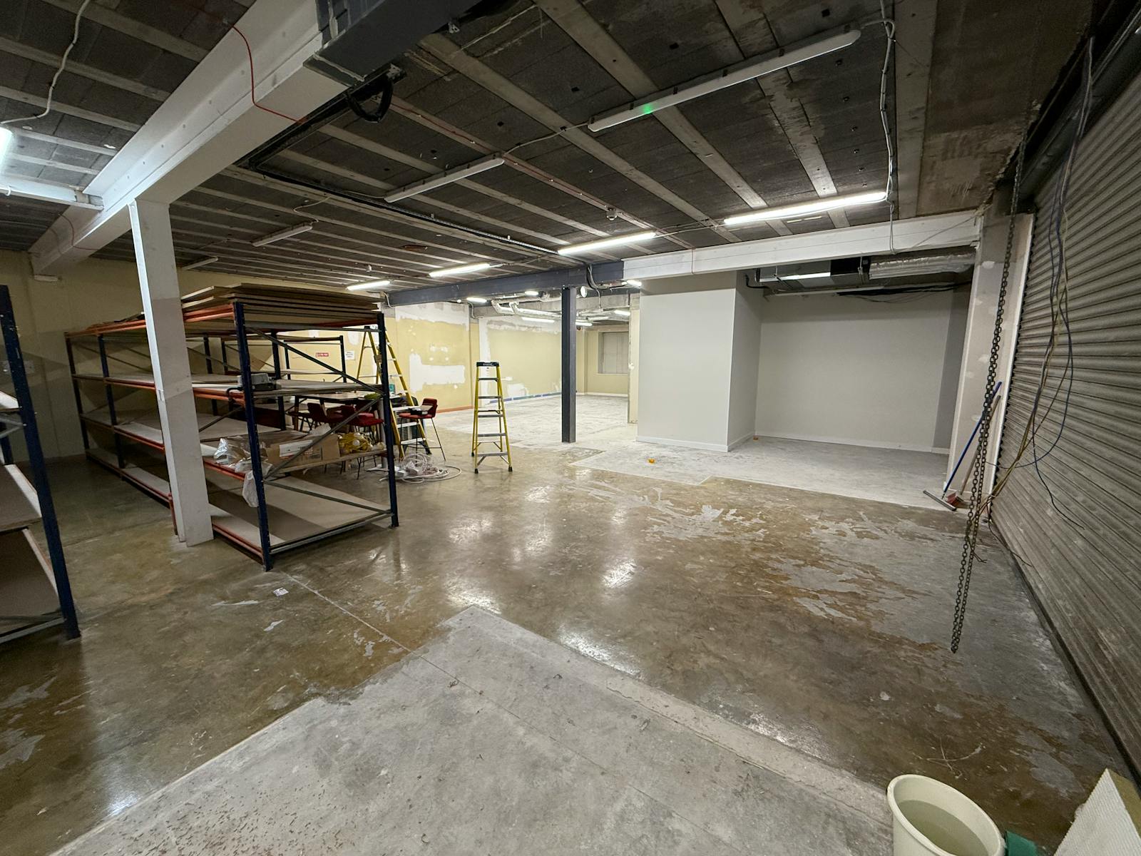 The warehouse is accessed via an automated sectional up-and-over grade door. This area also includes a concrete mezzanine floor.