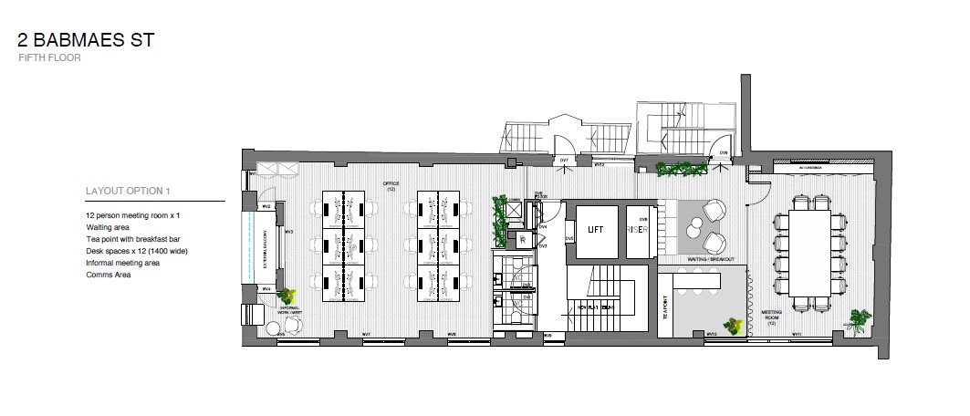 The 2nd floor provides newly refurbished, Grade A office space. The floor has been fully fitted to accommodate 12 desks & chairs, a conference room, two small meeting rooms, kitchen and break out areas. The floor has excellent floor to ceiling heights, fantastic natural light and charming views of Babmaes Street.