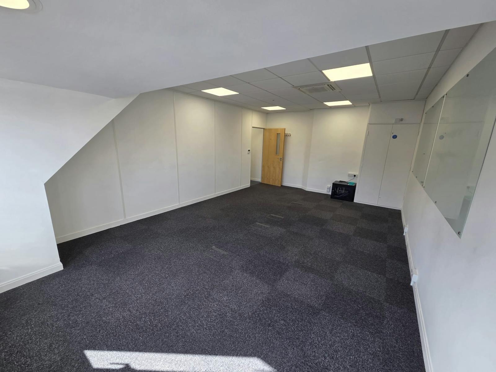 This office building features a welcoming ground-floor reception area, with both stairs and a lift providing access to the first and second-floor offices. Each office is fitted with suspended ceilings, integrated lighting, carpet tiles and air conditioning. Communal toilets and a kitchenette are available on every floor.