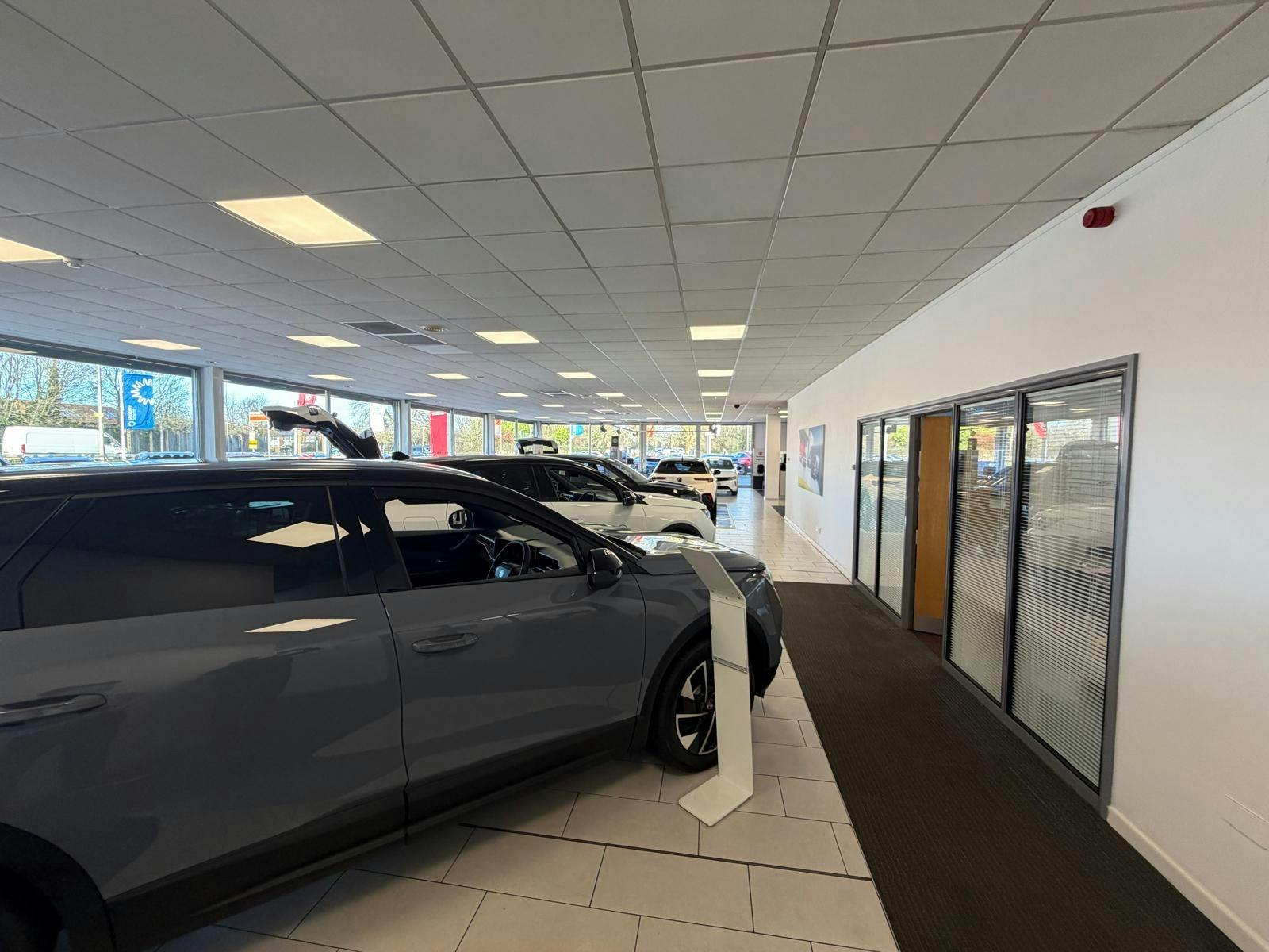 Access to the main showroom area is through a glazed entrance, with the workshop areas accessed through roller shutters to the side and rear.