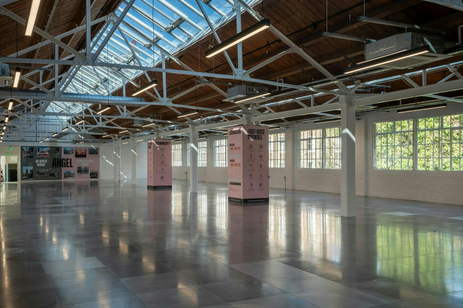 A distinctive headquarters combining a characterful warehouse and a Grade II listed Georgian townhouse. The warehouse space features expansive floorplates with ceilings up to 5m, exposed brickwork, abundant natural light, and direct access to outdoor courtyards. Modern amenities include fresh‑air mechanical ventilation with heat recovery, contemporary design throughout, private townhouse offices across five floors, a wellness/yoga room, showers, 12 WCs, 32 lockers, and a DDA lift. The building also benefits from 14 internal and 16 external bike stands, four electric bike charging points, LED lighting, and photovoltaic panels.