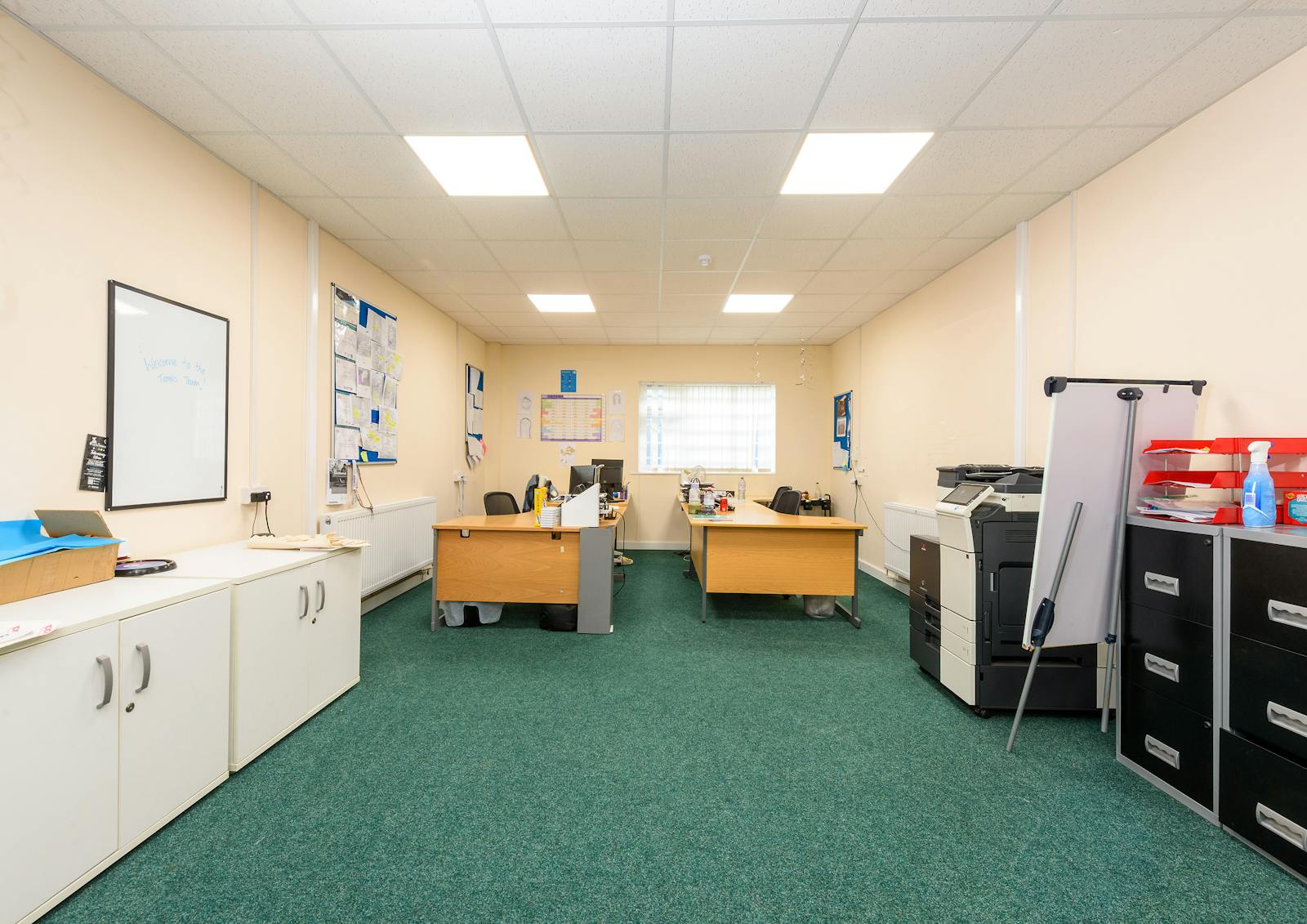 Internally, the property is configured to include a reception area to the front entrance, along with a number of office and training rooms, divided by both solid and stud partition walls. The property features suspended ceilings, painted and plastered walls, carpeted floors, and gas central heating. Additional amenities include kitchen and WC facilities.