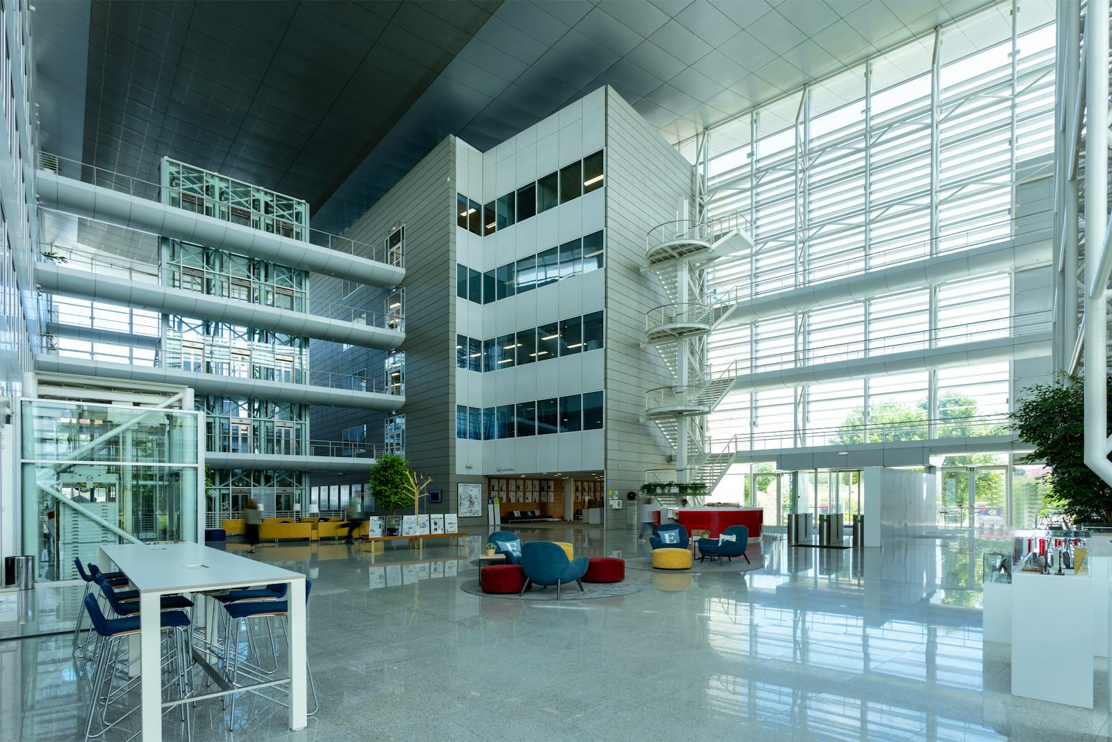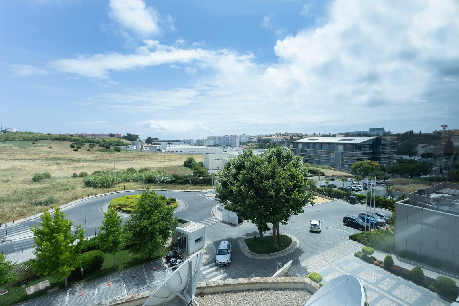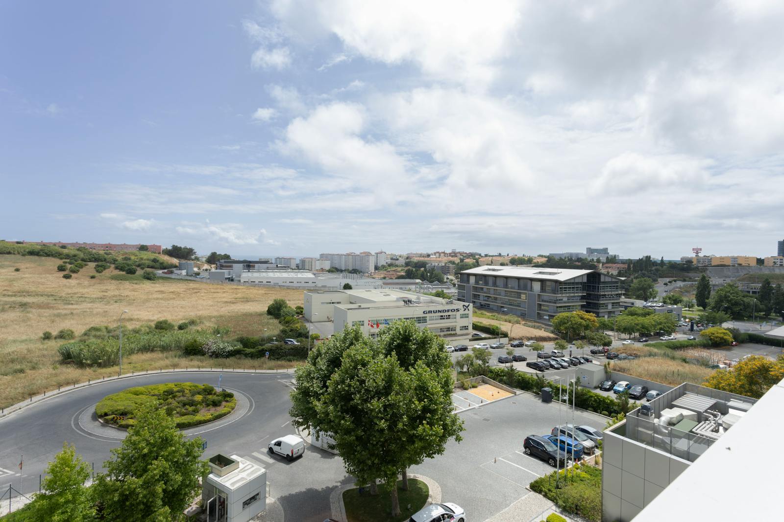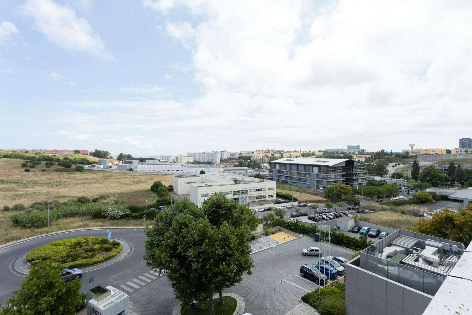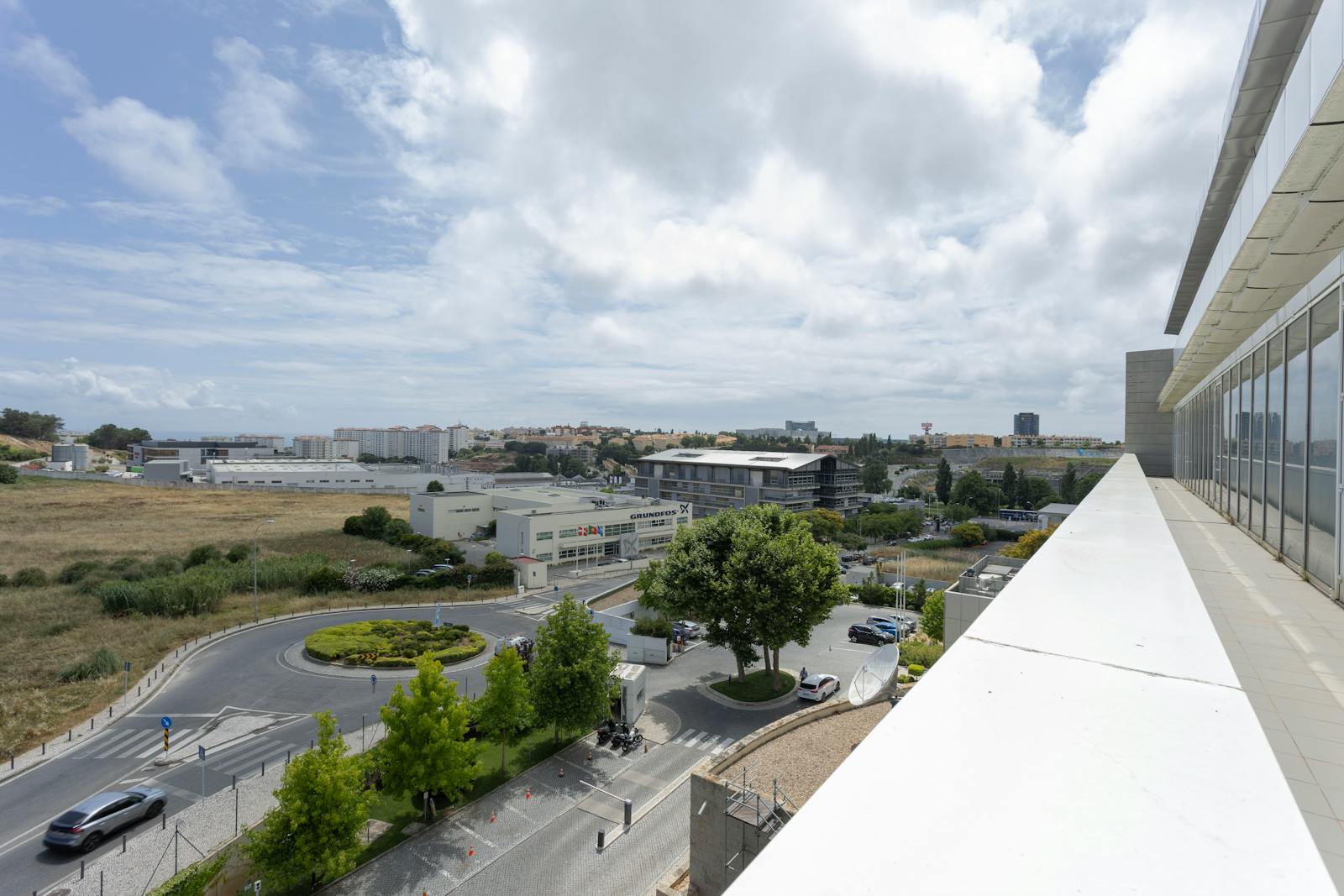 A área circundante é caracterizada por espaços verdes, zonas residenciais e outros edifícios de escritórios, o que contribui para um ambiente profissional e agradável.