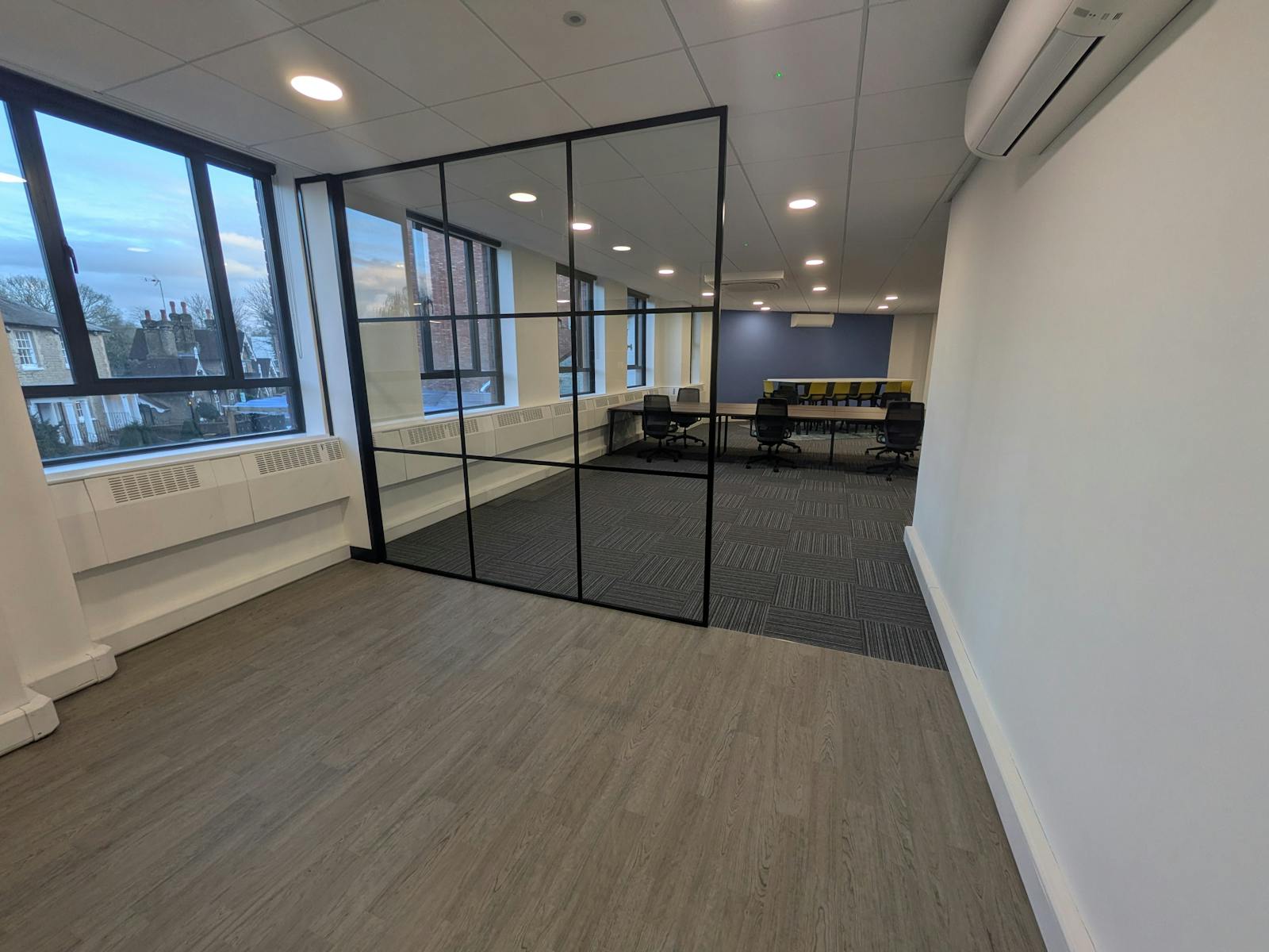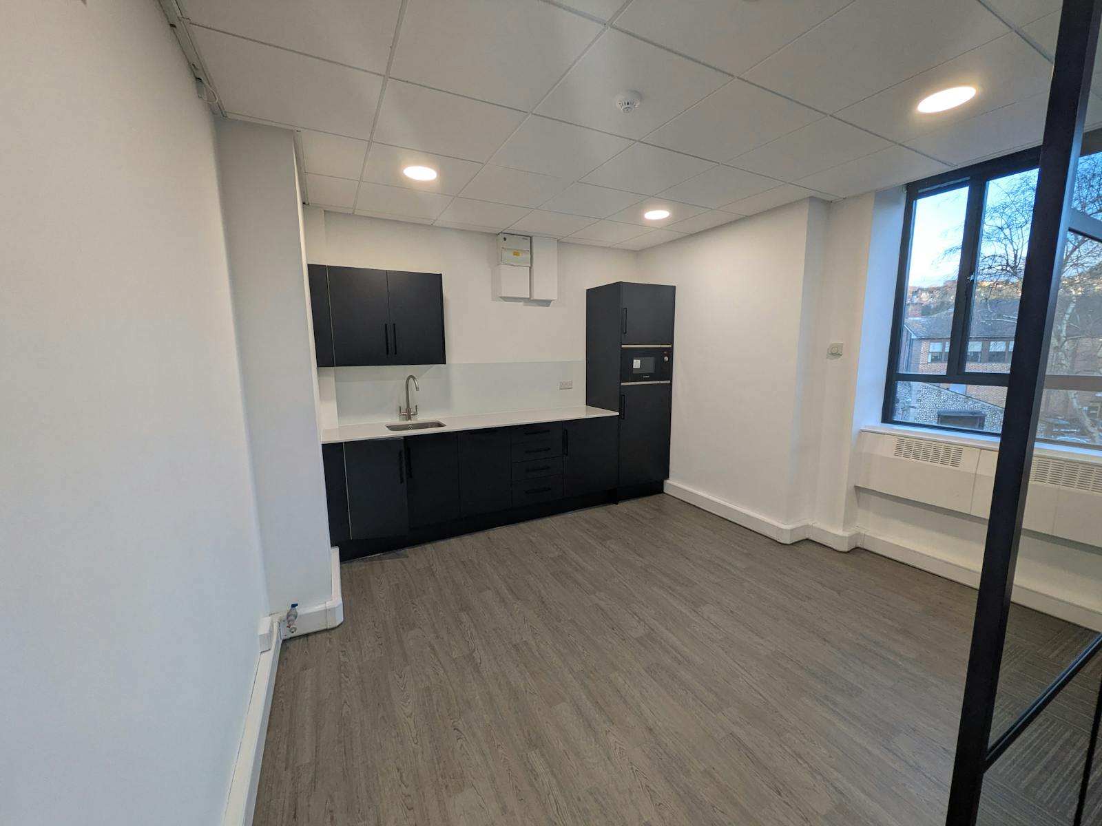 A first floor office premises offering ample natural light, a large office area, and allocated kitchenette/break area for staff. The premises come with a full intercom system, on-site parking for one vehicle, and common areas maintained by the landlord. WC units are communal.