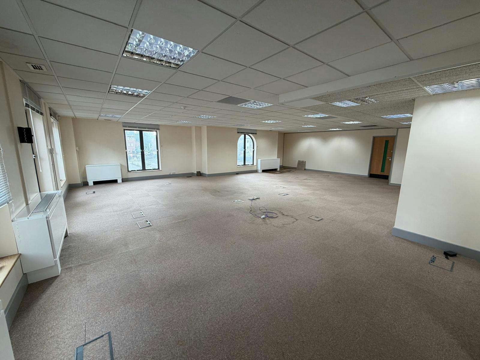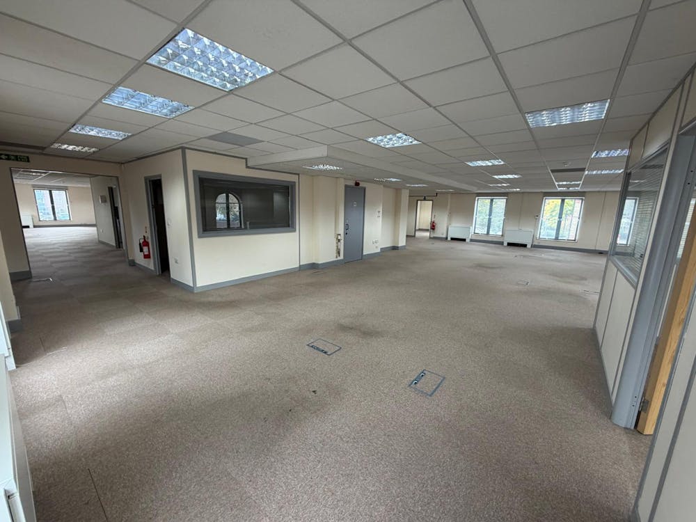 The office suite is on the first floor of a prestigious building, featuring air conditioning, a suspended ceiling with lights, double glazing, and a kitchenette. Each floor has WC facilities, access to two passenger lifts, and allocated parking.