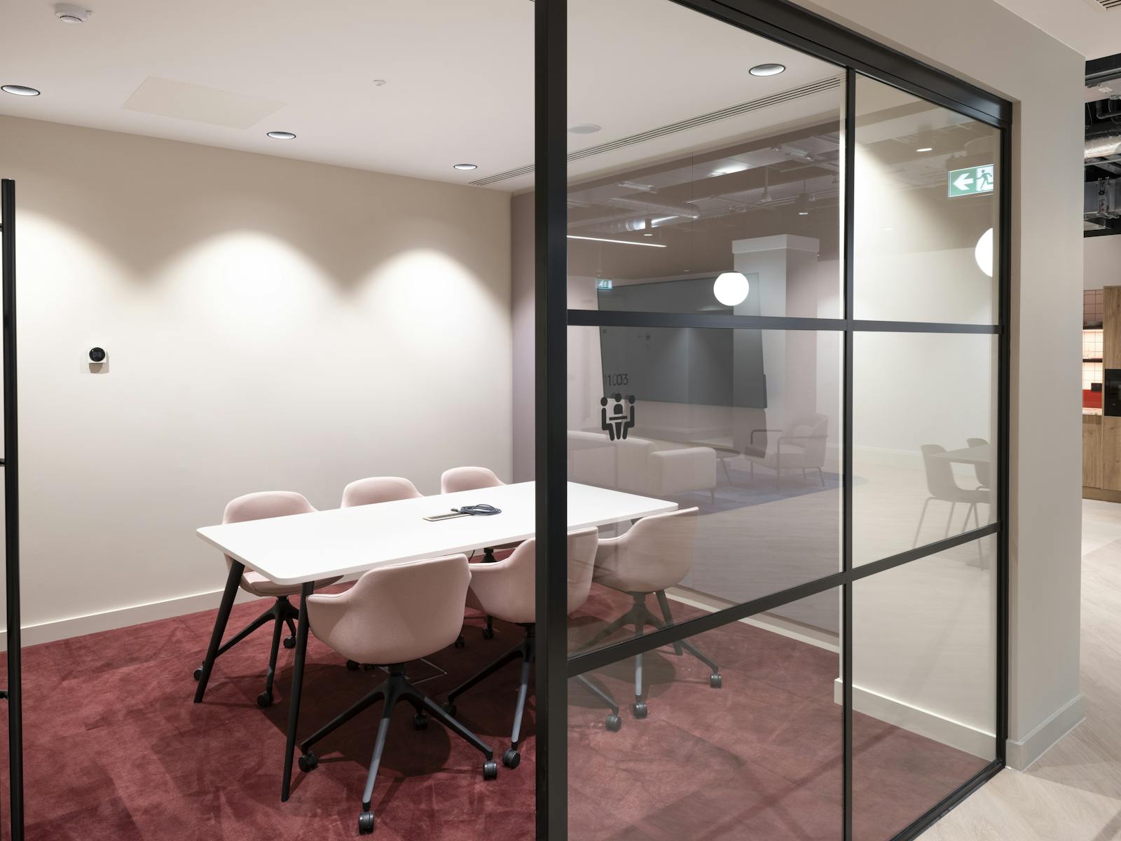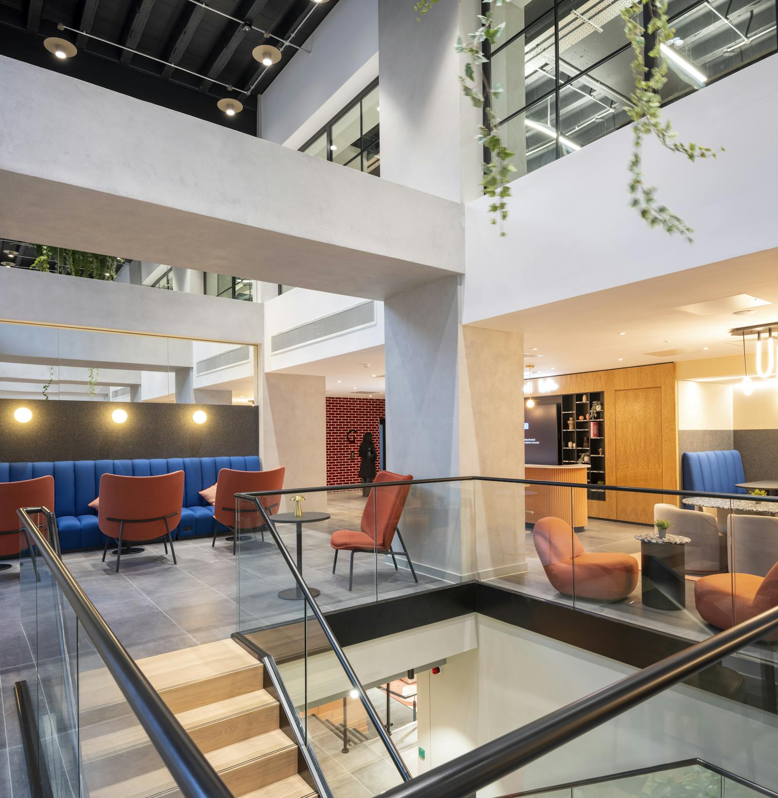The remodeled reception offers 3,500 sq ft of communal meeting and working space. A newly created opening in the ground floor leads to the wellness area in the basement, which offers a gym, yoga studio, presentation room and contemplation pods. As you would expect the basement has shower and changing facilities for the tenants to use.
