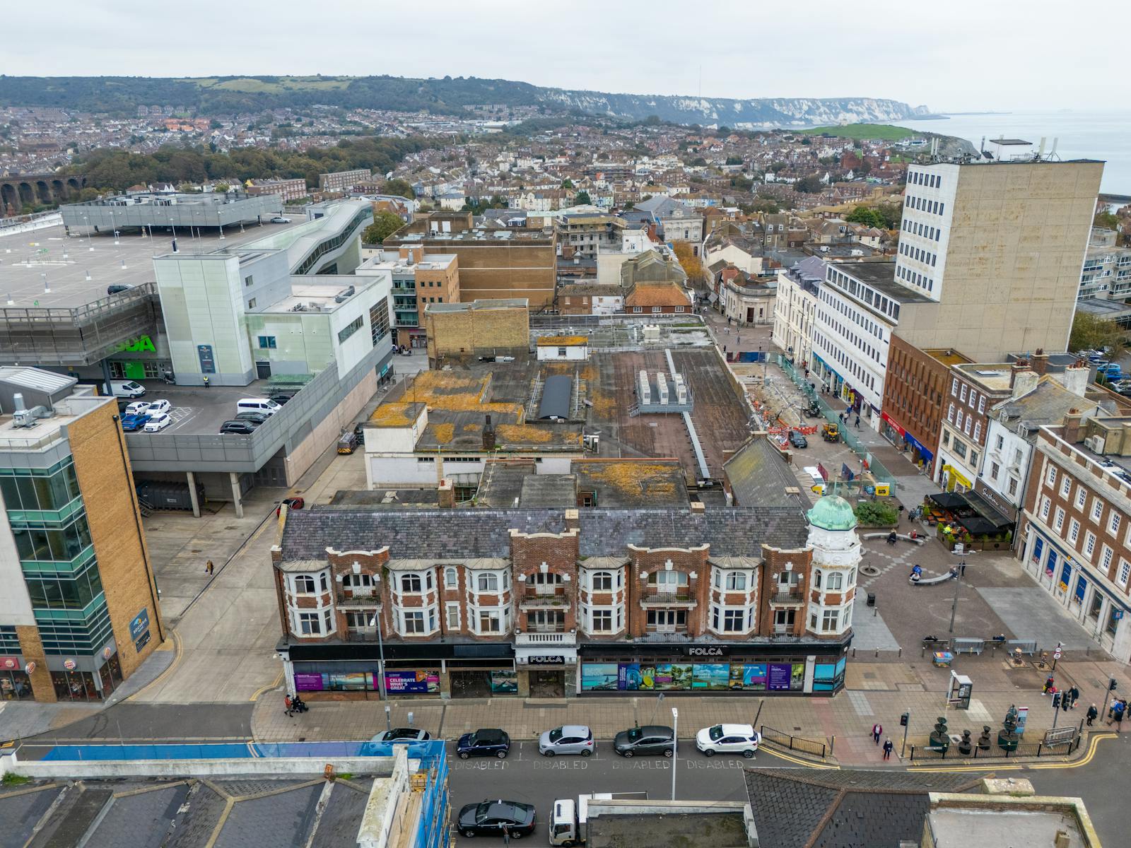 The Property occupies a prime position in the heart of Folkestone town centre, bounded by Bouverie Square, Albion Mews Road, and Sandgate Road. The surrounding area offers a lively mix of retail, leisure, and community uses, creating a vibrant and well-connected setting.