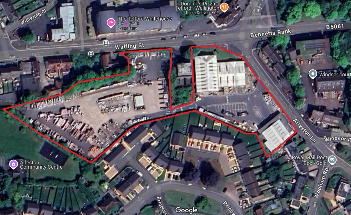 The property is located at the junction of Watling Street and Arleston Lane in area of mixed roadside commercial development with surrounding occupiers including Telford United Football Club and Farr and Harris.