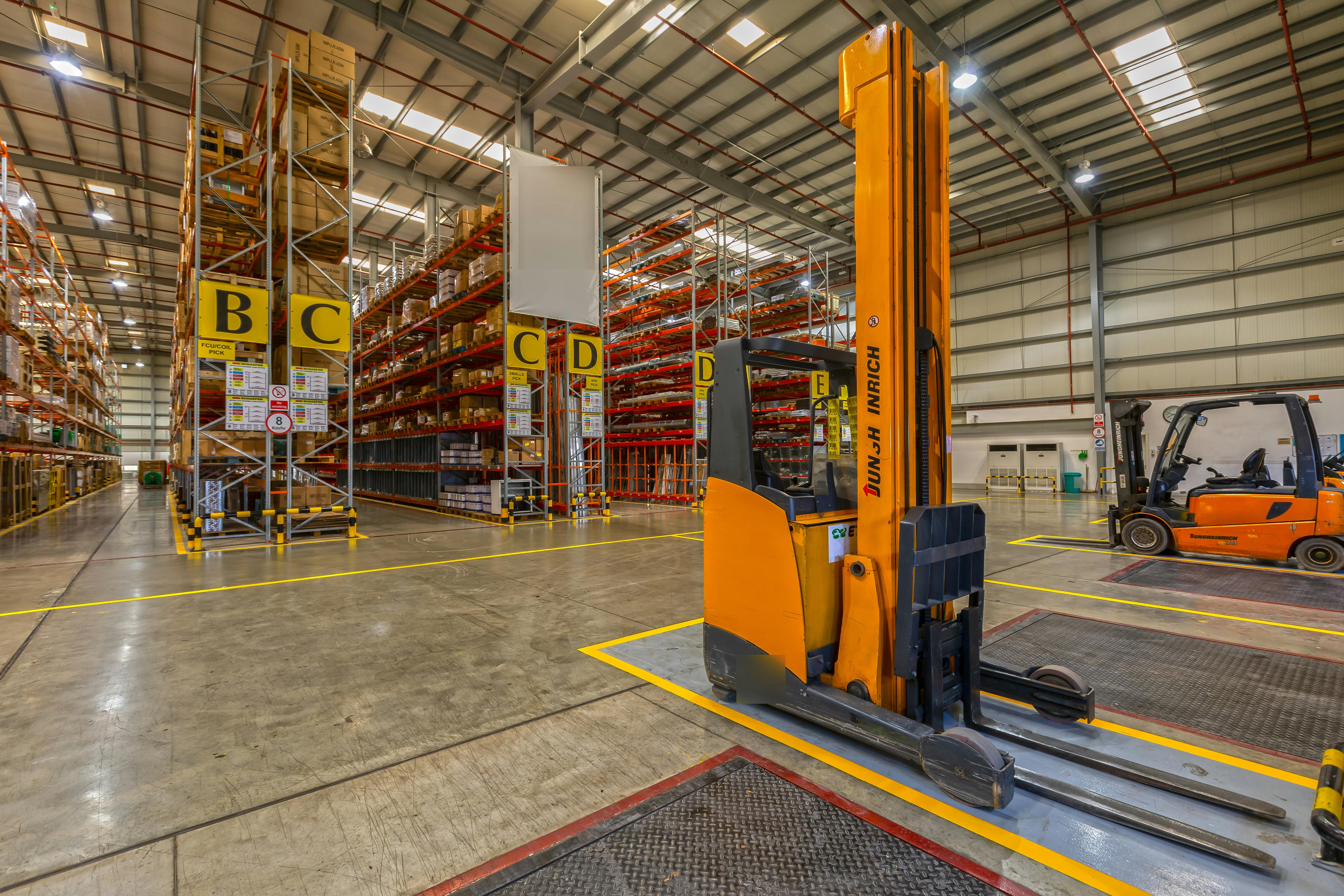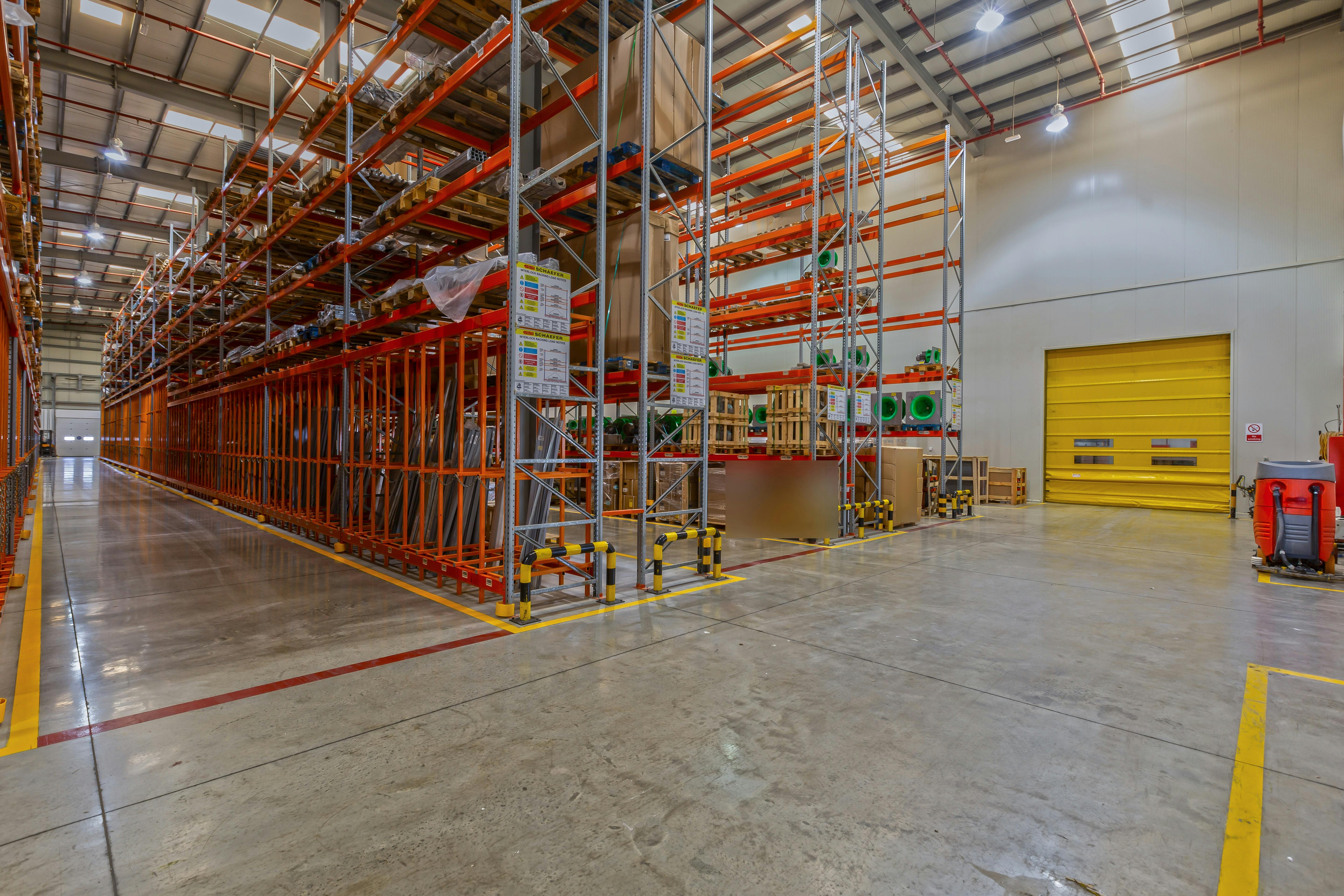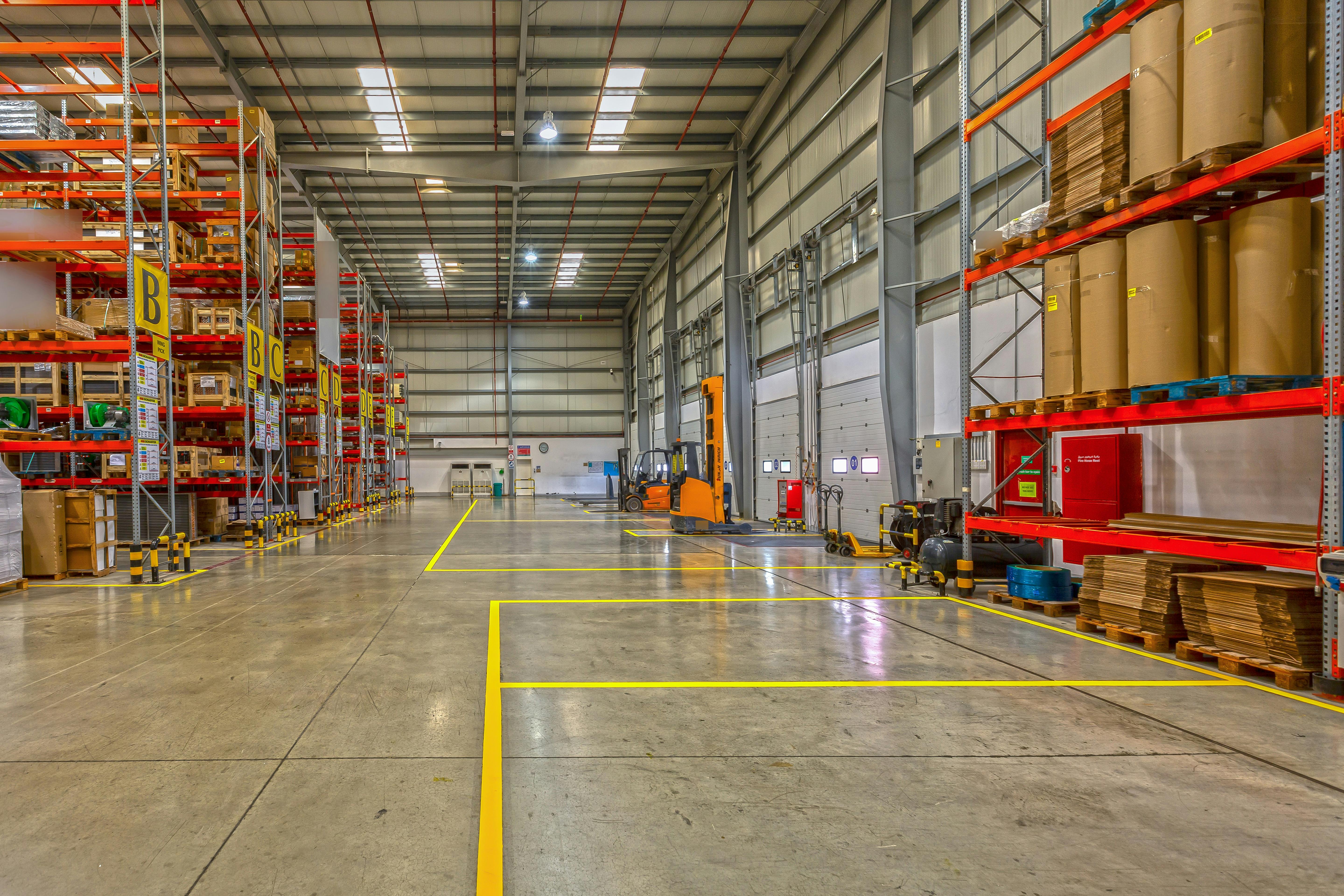The warehouse, which was constructed in 2015, is of steel portal frame with block-work infill. The property is of steel frame construction and can broadly be split into two sections, one of which is a temperature controlled chamber (maintained between 20-24 degrees) and the second which is a larger fully racked (SSI Schaefer racking) area. The warehouse benefits from a ‘super flat’ concrete floor which has clearly been well maintained and shows no visible signs of cracking or ageing. The walls and ceiling are insulated and the warehouse benefits from a full overhead sprinkler throughout. Lighting is provided through translucent skylights and artificially via high bay lighting.