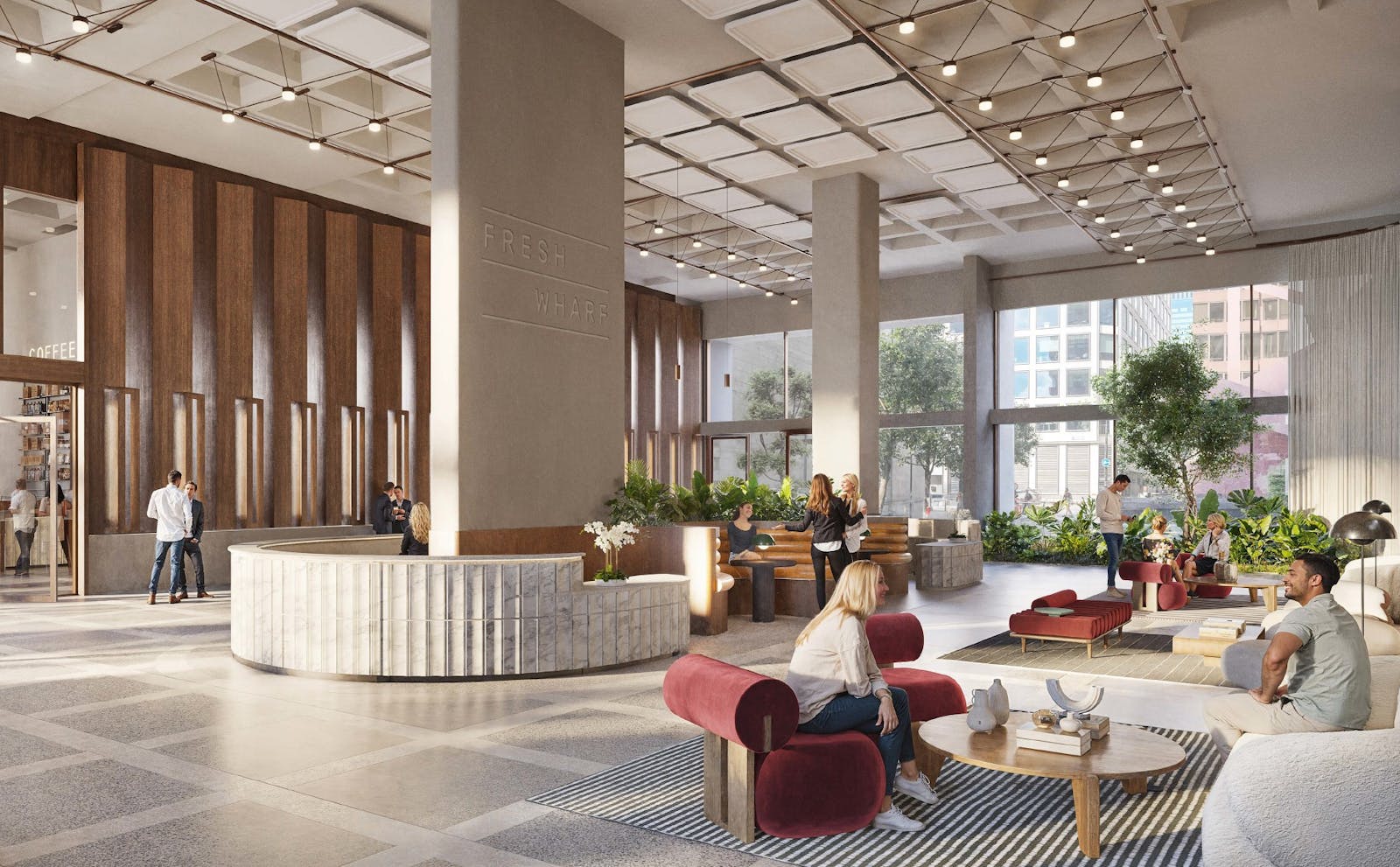 Fresh Wharf has sweeping dual entrances into a reception finished in high quality materials that invites everyone through with a grand arrival. Activated with social spaces throughout that work from the moment you arrive. Picking up a coffee from the lobby cafe to enjoy in the landscaped courtyard or riverside garden, or on your way up to the business lounge.