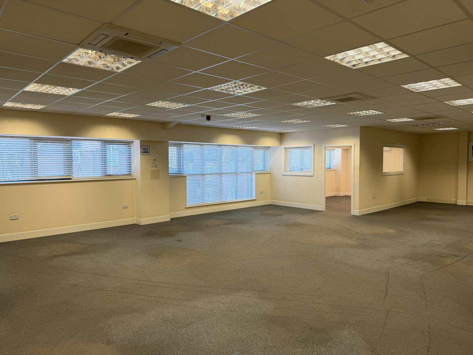 The offices are well appointed, featuring glass partitioned meeting rooms, carpeted floors, floor boxes, and LED lighting throughout.