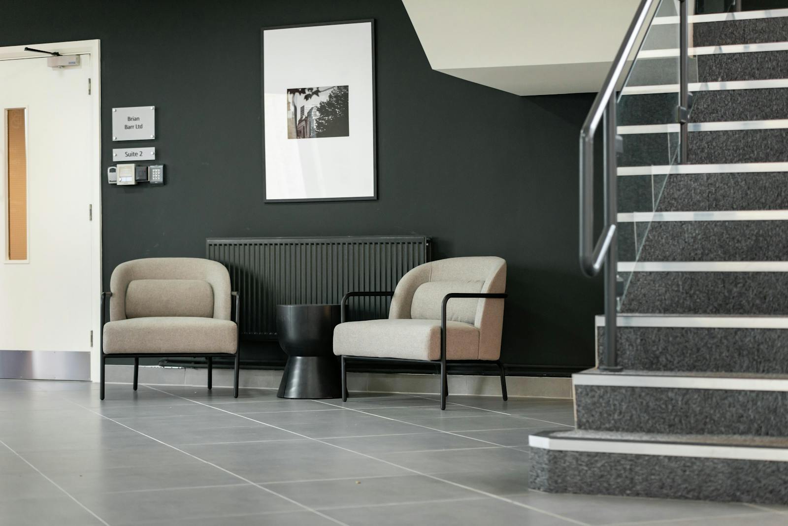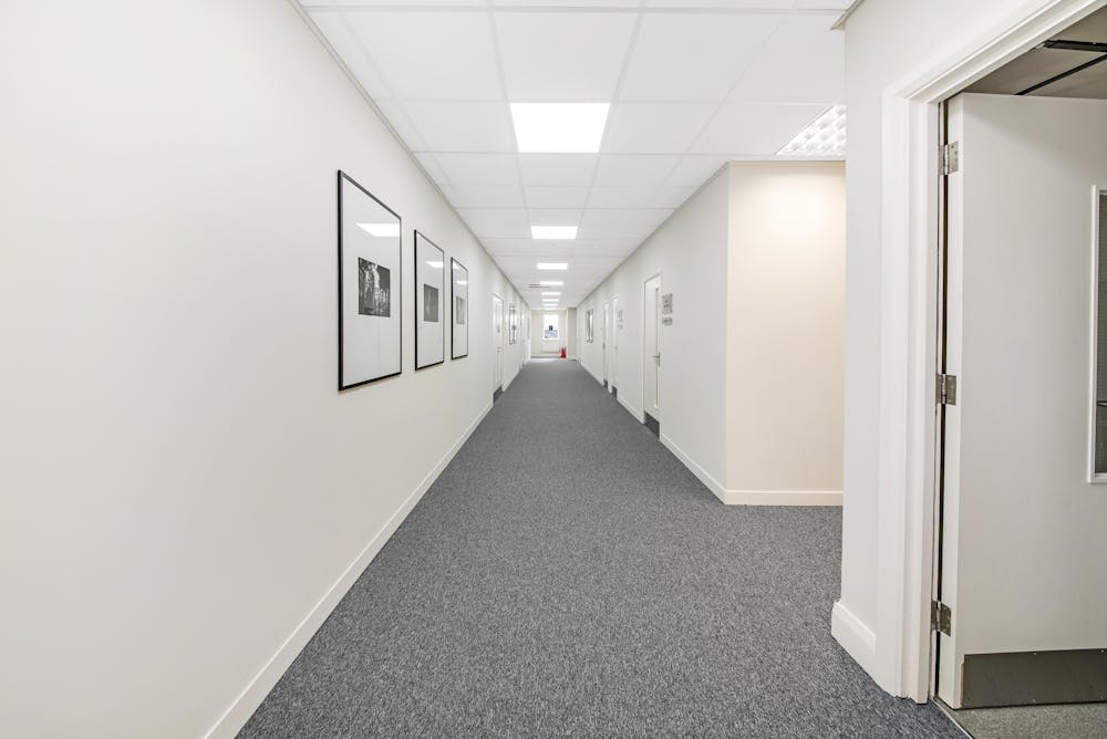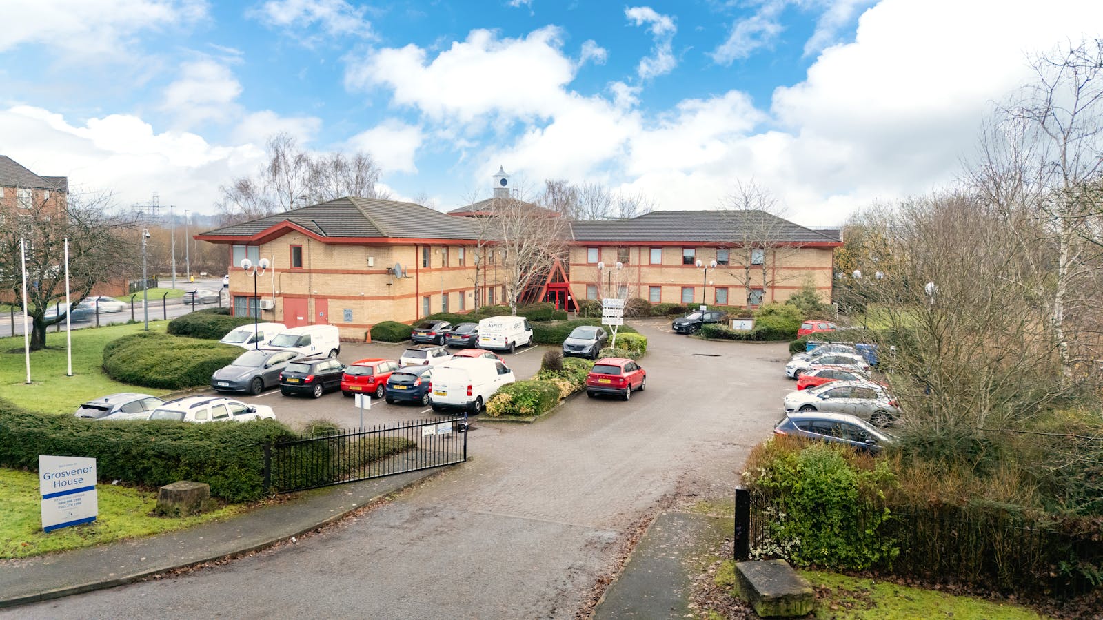 Grosvenor House is a two-storey, purpose-built office building dating from the 1980s, offering approximately 10,000 sq ft of professionally finished workspace. Visitors enter through a dramatic full-height atrium, complete with lift access and gender-specific restroom facilities. Suites are available from 230 sq ft to 264 sq ft, with the flexibility to combine spaces as required. Interiors benefit from features such as gas central heating, suspended ceilings with Cat 2 lighting, double glazing, and shared tenant amenities. The site includes a spacious, secure car park and is monitored by CCTV, ensuring privacy and access control.