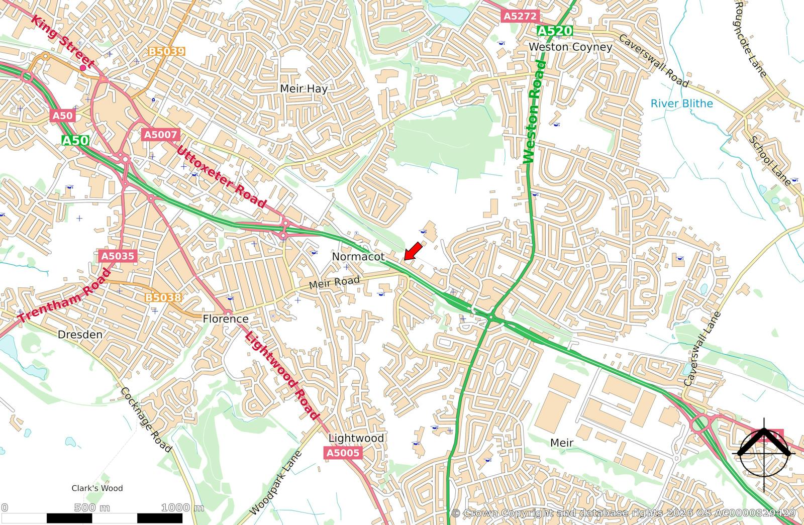 The location benefits from excellent road communications, with the A500 located approximately 3 miles, providing direct connections to the M6 motorway and the regional motorway network, as well as the A50 routes towards Derby and the East Midlands.