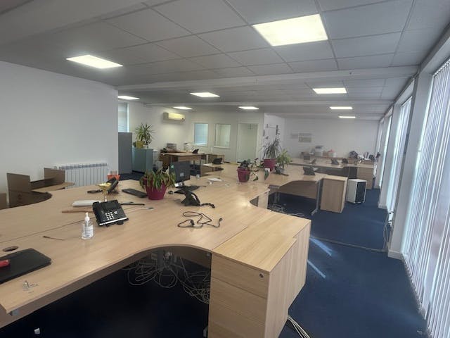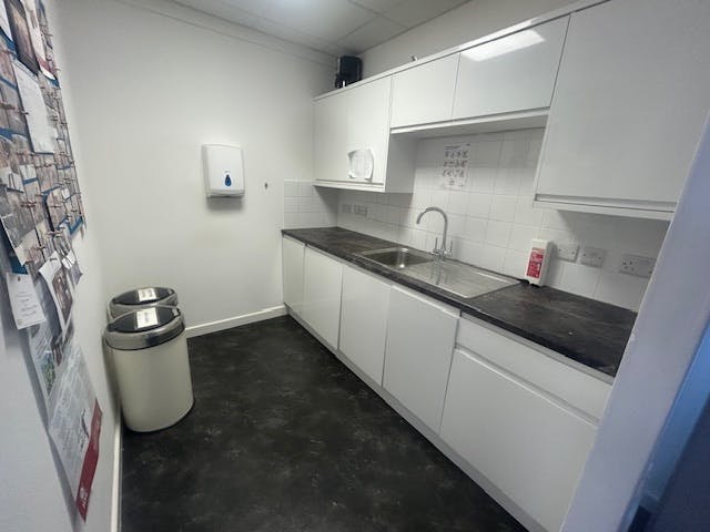 At first floor level is a mainly open plan office suite with one partitioned office / meeting room; a kitchen area and two toilets. The office space is fully carpeted; has a full suspended ceiling with integral lighting; wall mounted electric heaters and wall mounted air conditioning units. One elevation is fully glazed therefore the space benefits from excellent natural lighting.