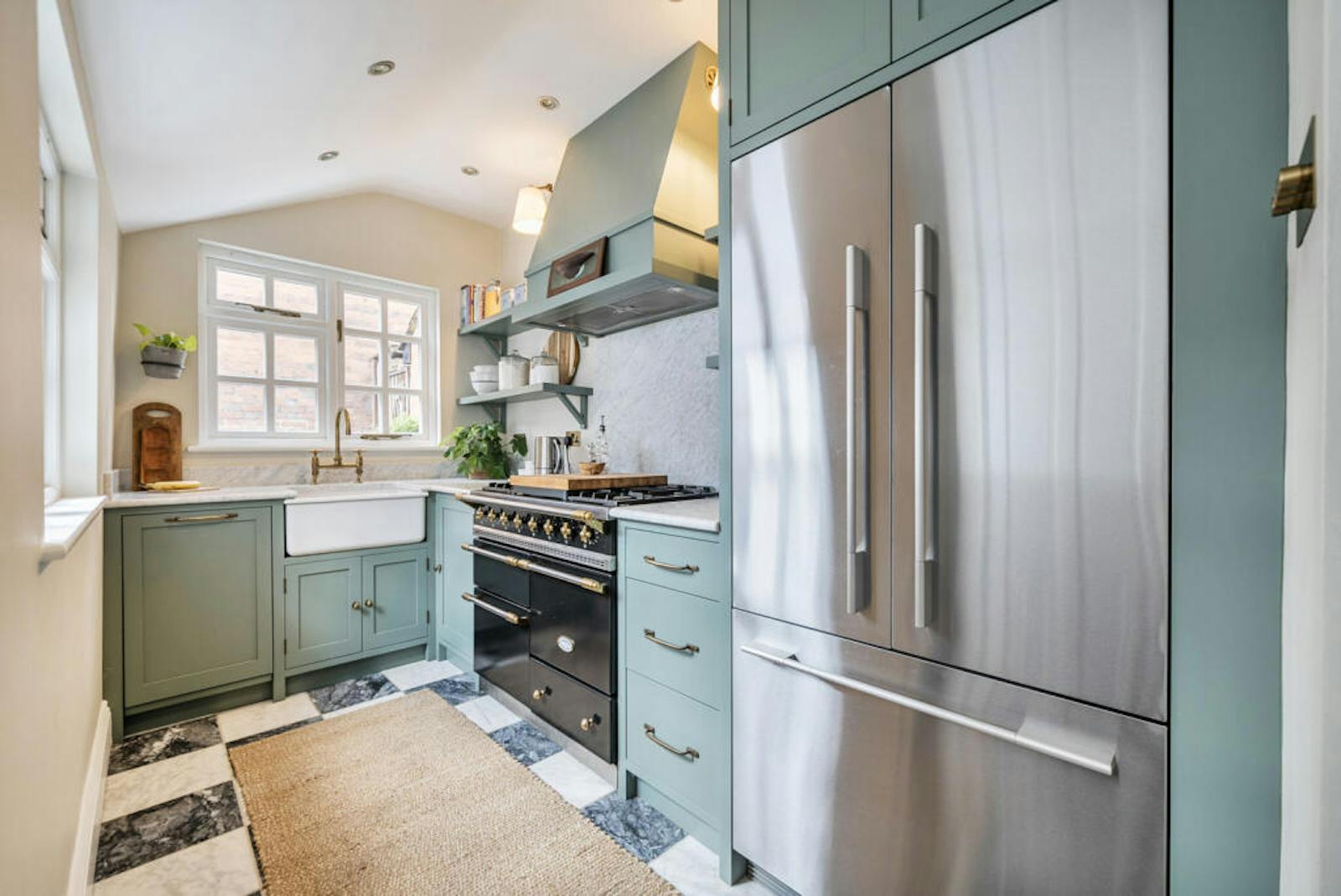 Inside, the bright sitting room features tall sash windows, stripped wooden floors and a fireplace with wrought iron surround. To the rear, the open plan kitchen and dining area includes marble worktops, brass fittings, a butler sink and a range cooker, with doors opening to the courtyard. The first floor offers the principal bedroom and family bathroom, while the top floor provides two further bedrooms with views towards the Thames.