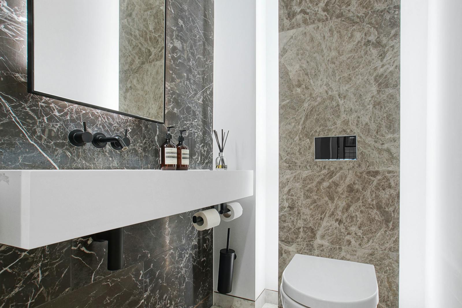 The reception is entered through an elegant frameless glazed door, with tri - tone marble flooring welcoming visitors to the building. A warm welcome is offered by the building's commissionaire.