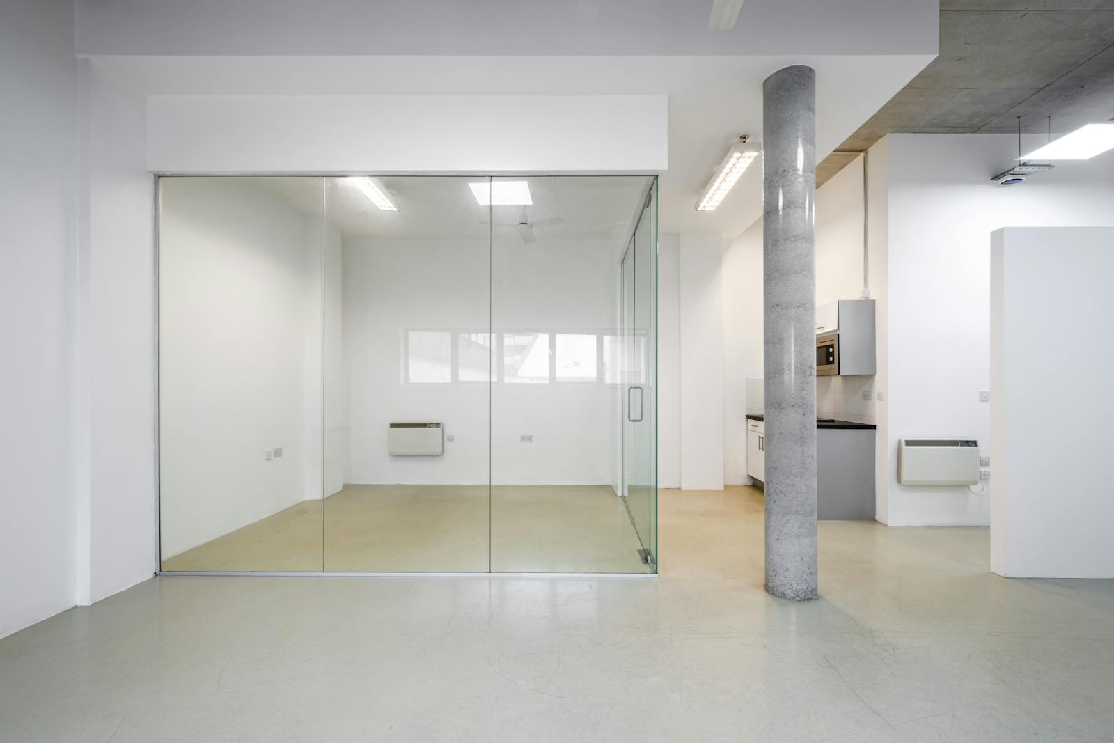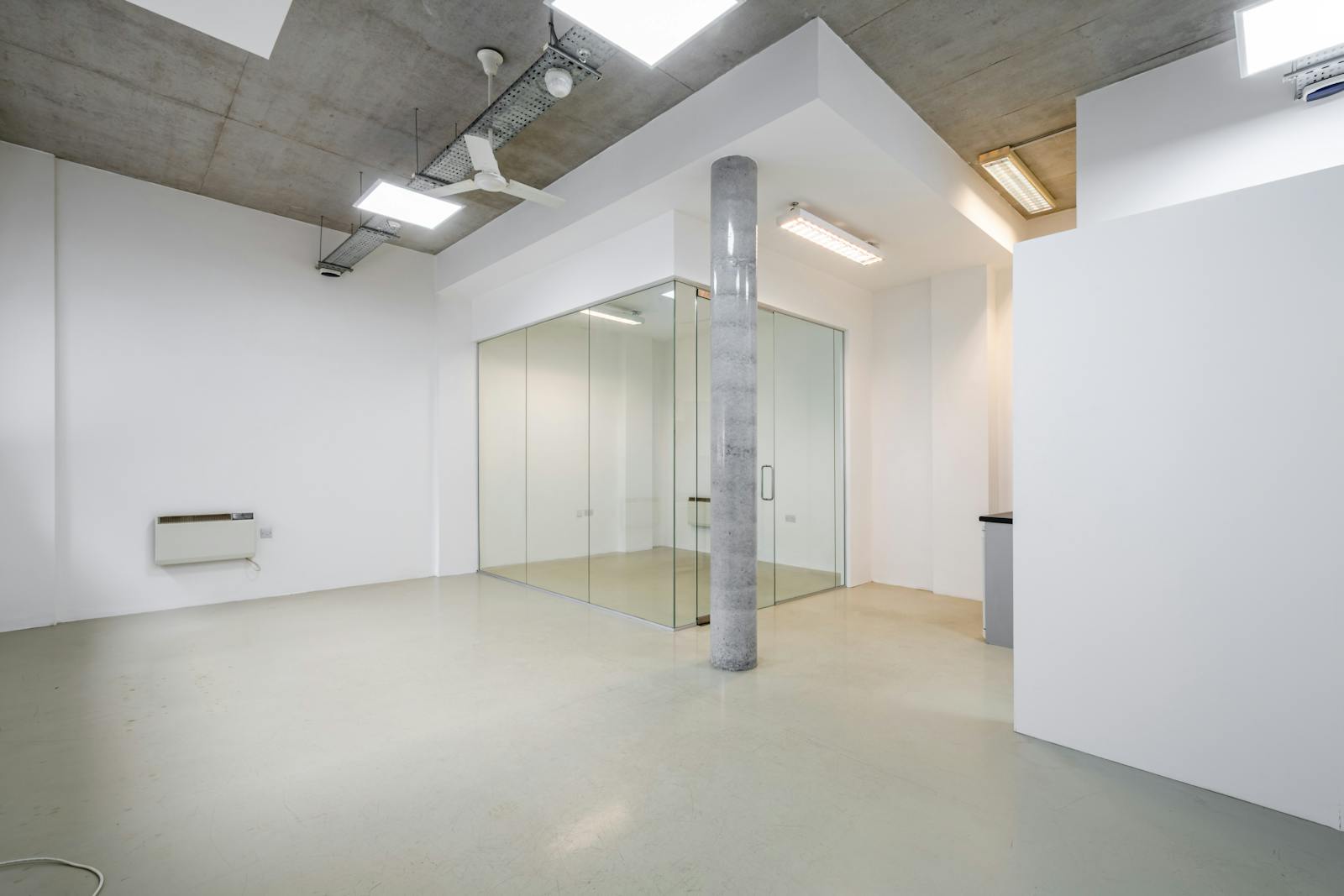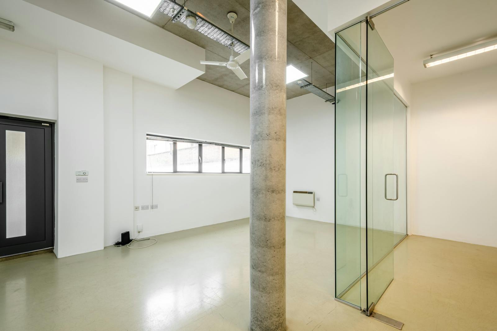 This bright and contemporary office unit offers a flexible open-plan layout, ideal for a range of business uses. The space features high ceilings with an exposed concrete finish, modern LED lighting, and a central column that adds character. A glazed partitioned meeting room provides privacy without compromising natural light, while large windows enhance the overall sense of space.