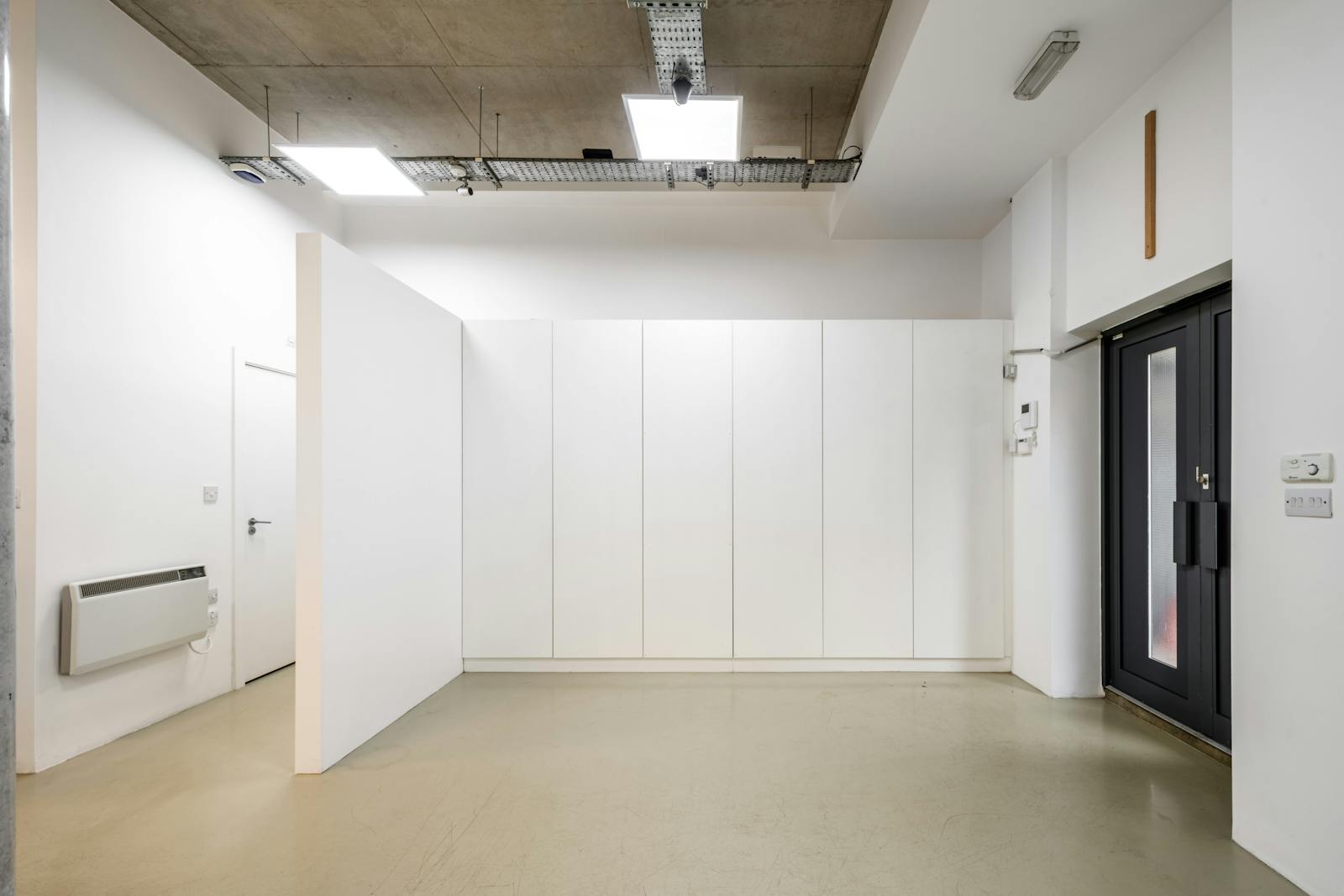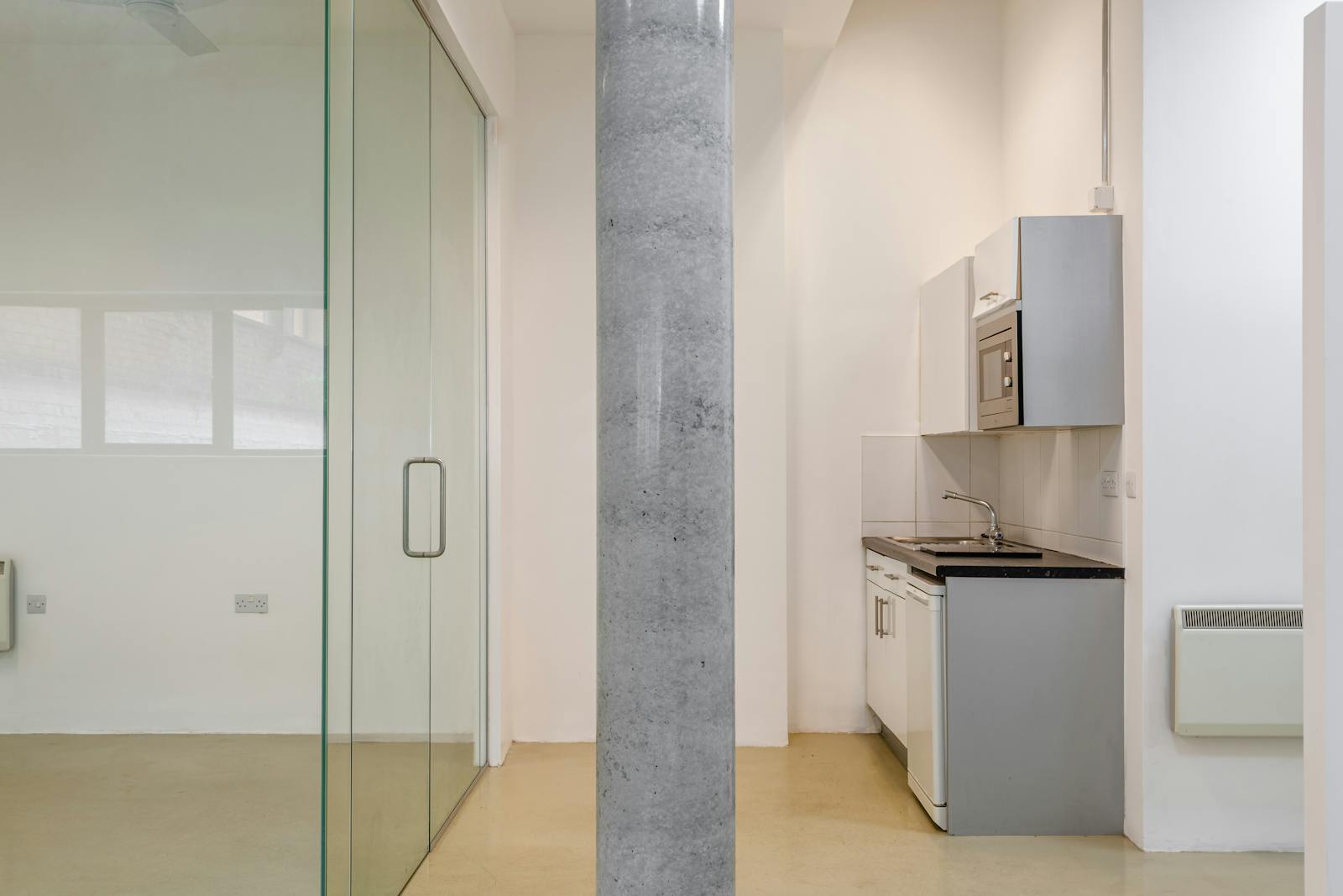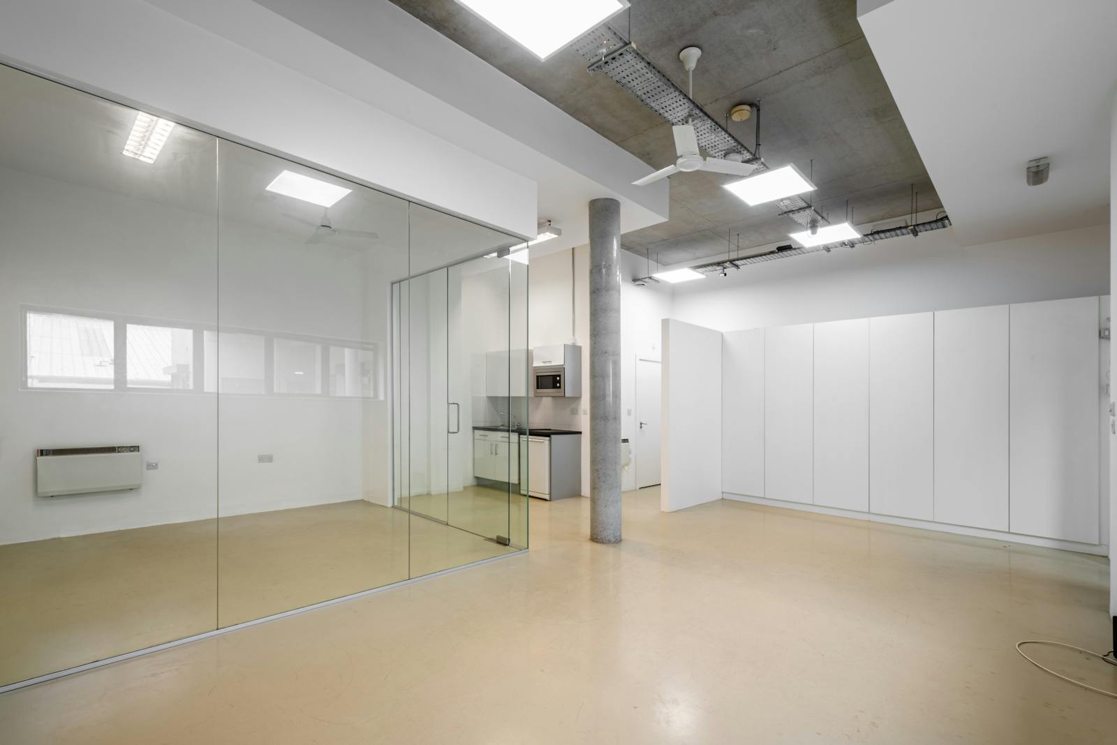 This bright and contemporary office unit offers a flexible open-plan layout, ideal for a range of business uses. The space features high ceilings with an exposed concrete finish, modern LED lighting, and a central column that adds character. A glazed partitioned meeting room provides privacy without compromising natural light, while large windows enhance the overall sense of space.