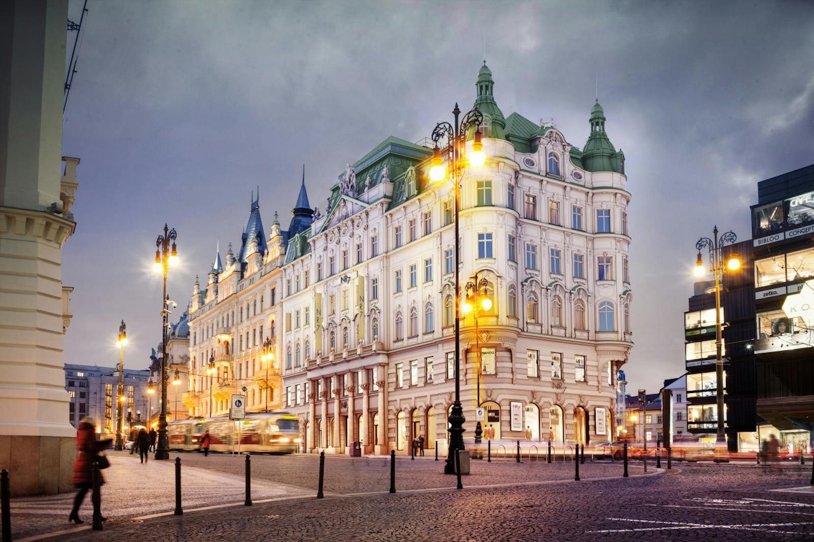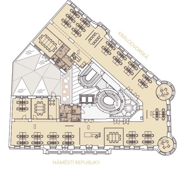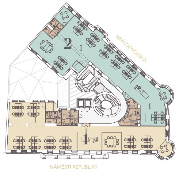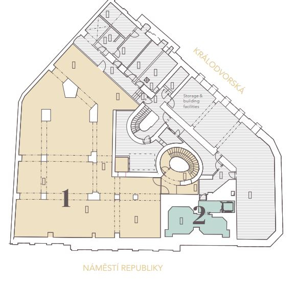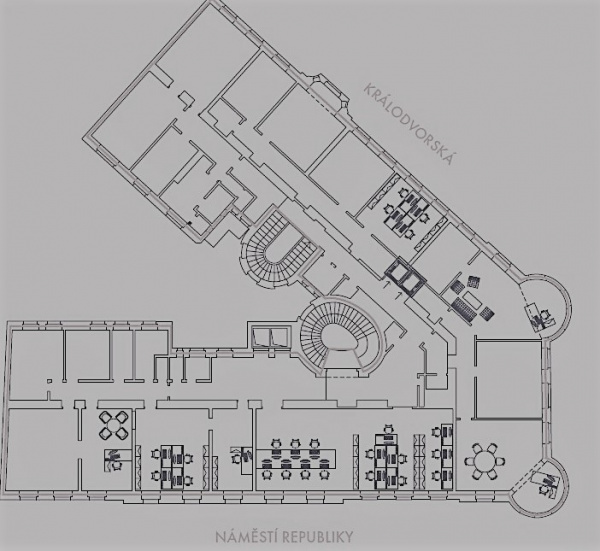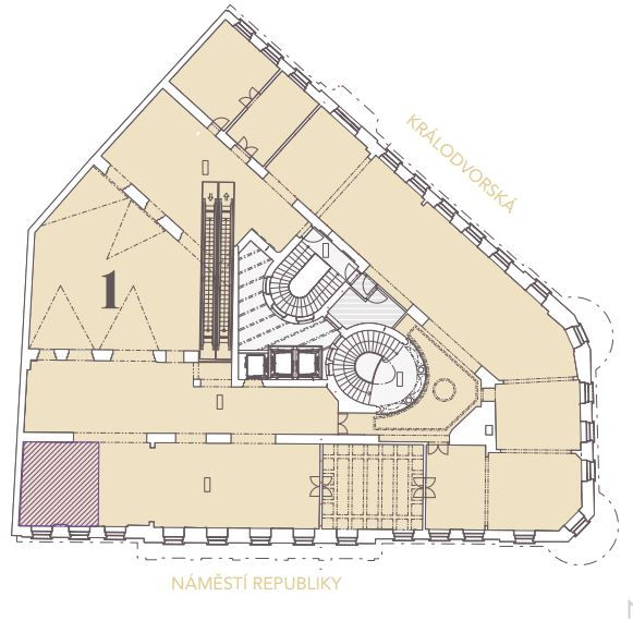 NR 7 is situated on a highly visible corner location facing directly onto Náměstí Republiky and opposite the Palladium Shopping Mall. The property also fronts onto Královodvorská Street, facing the iconic Kotva Department Store. Accessibility by public transport is excellent at Náměstí Republiky with metro station, tram, bus and train links all within close proximity. By car the property is easily reached via Revoluční Street and there are ample secure parking options nearby.
