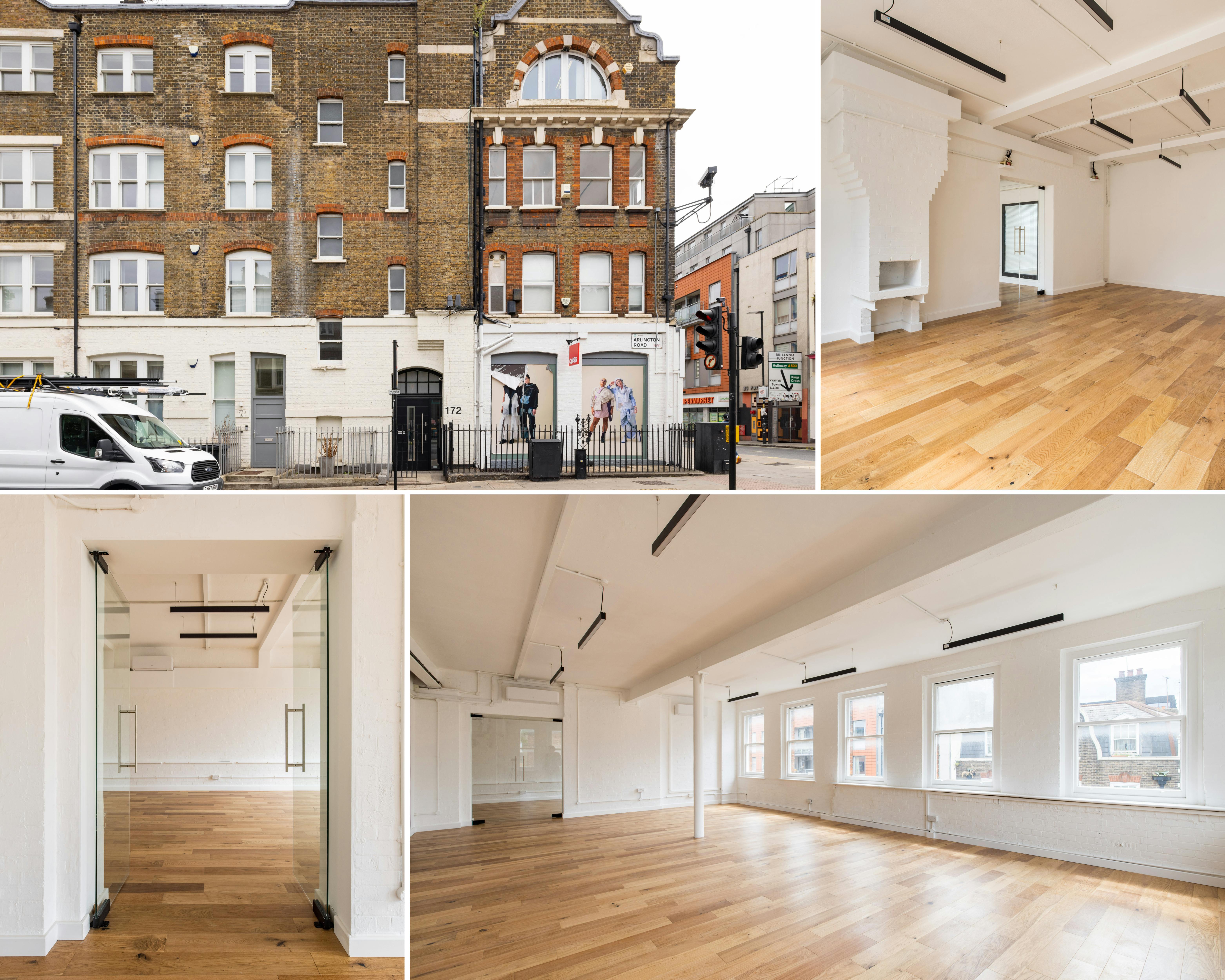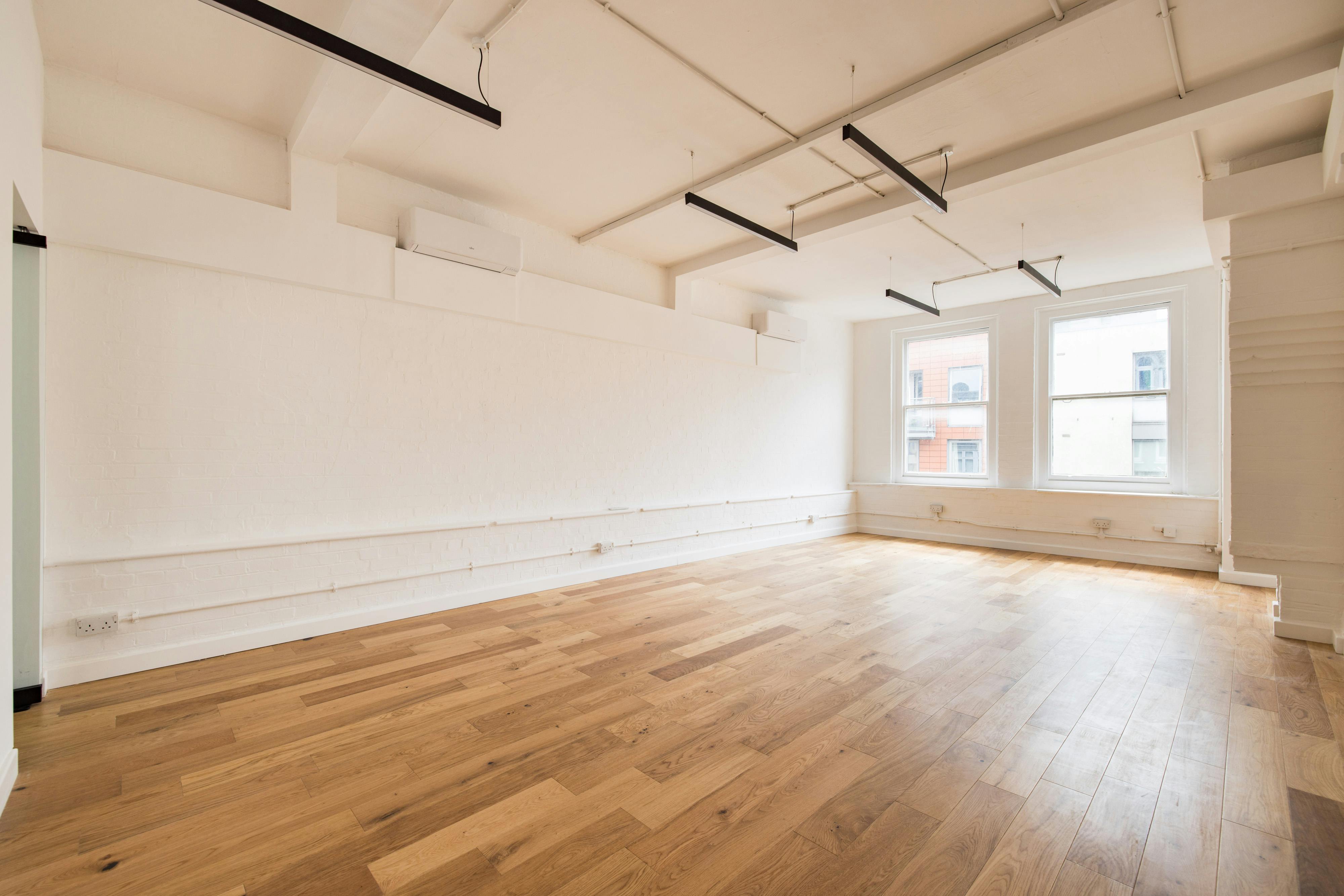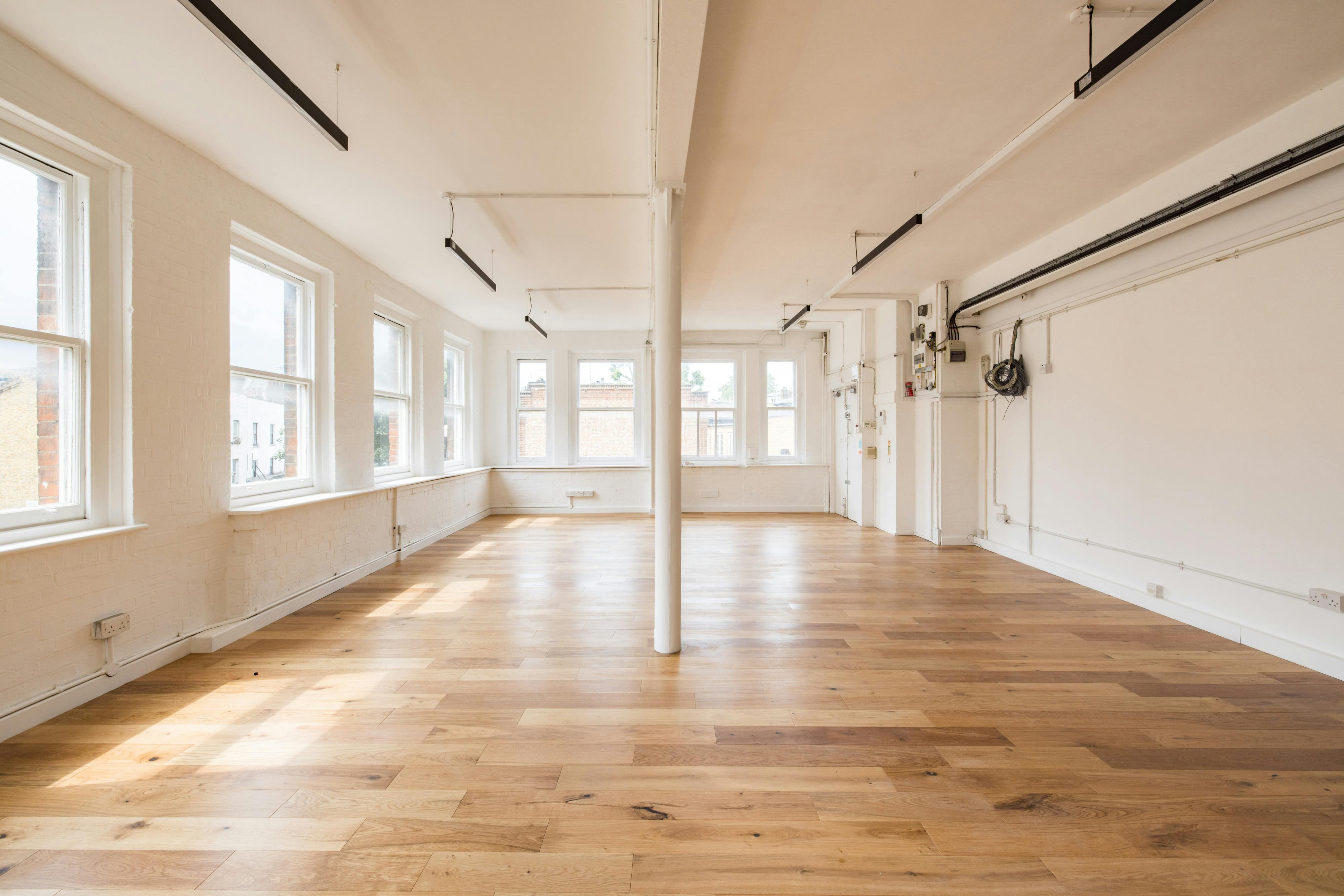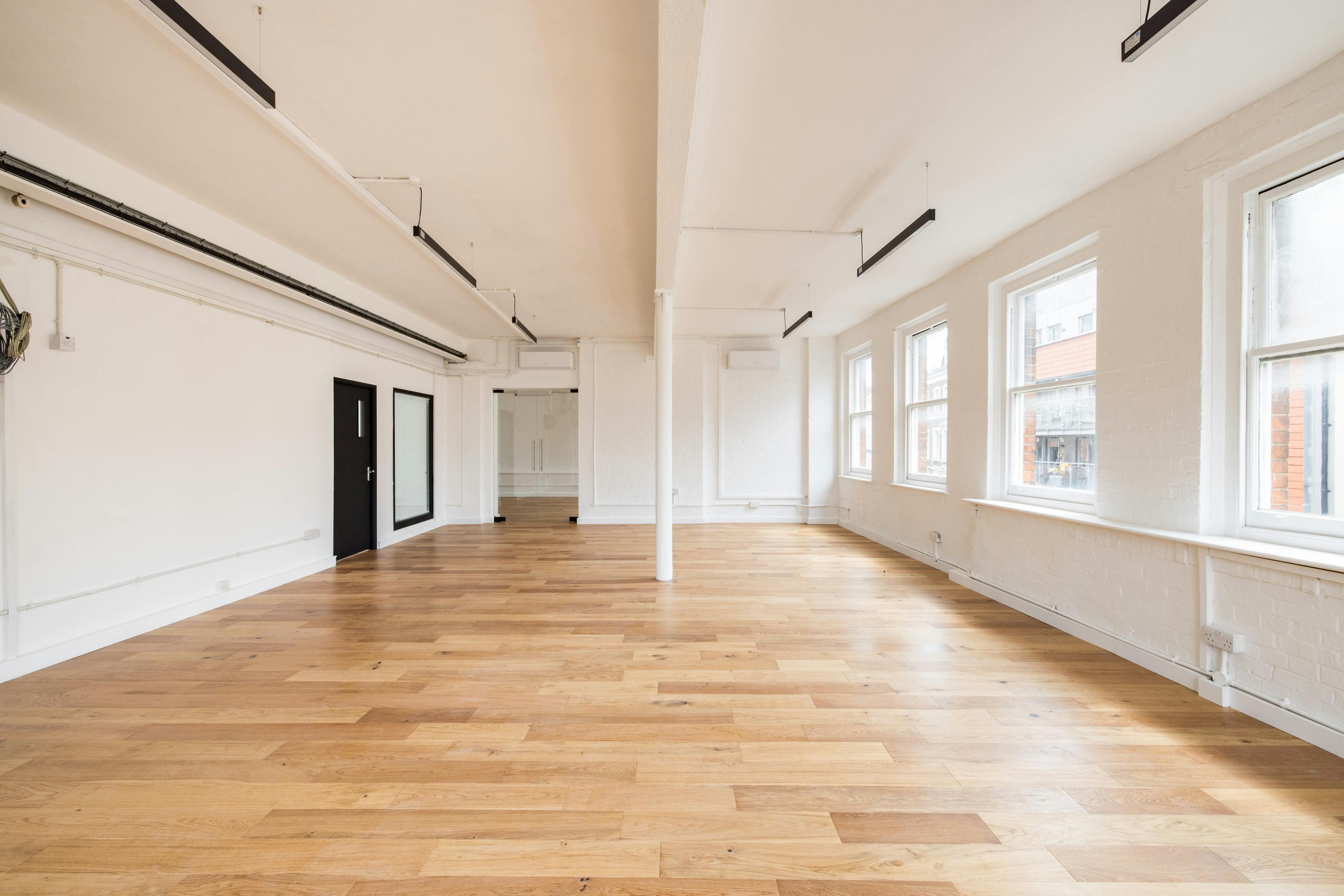 Newly refurbished 2nd floor with corner frontage and excellent natural light from 3 sides. The premises are suitable for those in the creative, media or music industries, otherwise suitable for a number of uses within business class E. The floor benefits from new LED lighting, new engineered timber flooring, comfort cooling, new kitchenette & WC. The offices are arranged as two open plan areas, a meeting room, kitchen and WC.