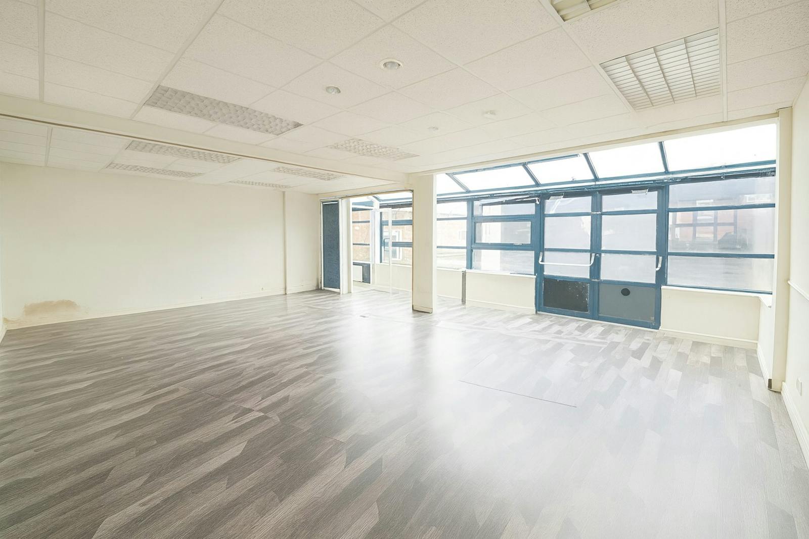 The premise is a rectangular single storey office building consisting of four offices, kitchen, WC and shower. The offices have suspended ceilings with CAT 5 lighting insets, laminate flooring to the main office and the other offices require a carpet or laminate finish.