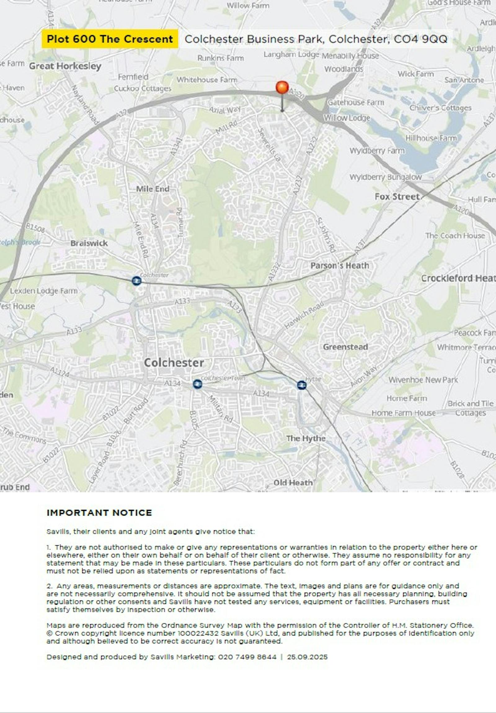 The site comprises an irregular shaped parcel of land measuring approx. 3.01 acres (1.22 Ha) fronting The Crescent on Colchester Business Park, which backs onto the slip road of J. 29 of the A12. Colchester Business Park and the adjacent Severalls Industrial Estate is a popular location for businesses in the town with good access to both J28 (Northern Gateway) and Junction 29 (Ipswich Road) of the A12. The purchaser will be required to enter into a Deed with the owner of The Crescent to document the construction of an entrance and access point, as shown in green, onto the Estate Road.