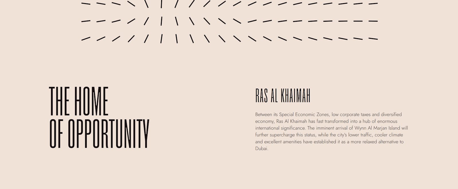 Between its Special Economic Zones, low corporate taxes and diversified economy, Ras Al Khaimah has fast transformed into a hub of enormous international significance. The imminent arrival of Wynn Al Marjan Island will further supercharge this status, while the city’s lower traffic, cooler climate and excellent amenities have established it as a more relaxed alternative to Dubai.