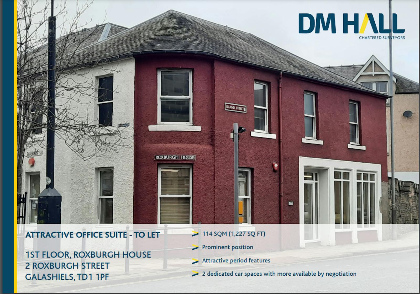 Galashiels is situated off the A7 amidst the picturesque Borders countryside and lies approximately 18 miles from Peebles, 40 miles south of Edinburgh and 58 miles north of Carlisle. The Scottish Borders Railway provides easy connectivity to Edinburgh and beyond via the station and the premises is in walking distance to railway and town centre. The town is located in the centre of the Scottish Borders and is the principal commercial and administrative hub for the area. The property is located outwith the town conservation area. Roxburgh Street lies adjacent to Island Street, one of the main arterial routes through the town. The office is prominently positioned with visibility to passing traffic and pedestrians. Nearby occupiers include Triage, Morrison & Murray Engineering Ltd, NHS Borders. ‚òaward winning‚ Indian restaurant across the road, Scotland eye Vision and a hairdressers.
