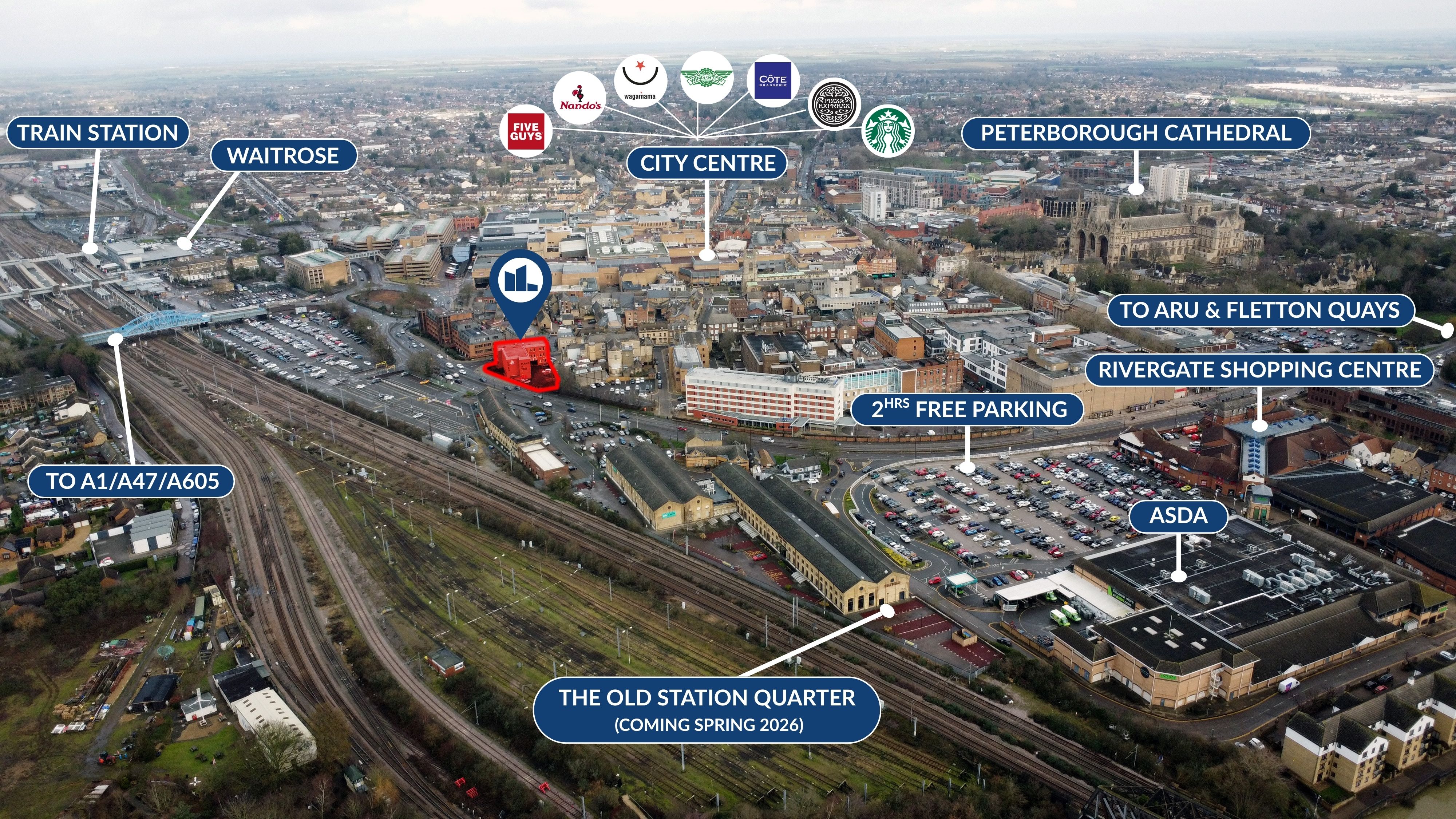 The building is extremely well positioned overlooking Peterborough station car park, within the established and historic Priestgate business district. It will benefit from the development of the station quarter regeneration project that will significantly improve the profile and quality of the location. Already we have seen many new occupiers coming to this part of Peterborough, including the very exciting Old Station Quarter located opposite in Unex House - bringing together premium fitness, recovery, grooming, creativity and social spaces. Occupiers can benefit from social membership to this space.