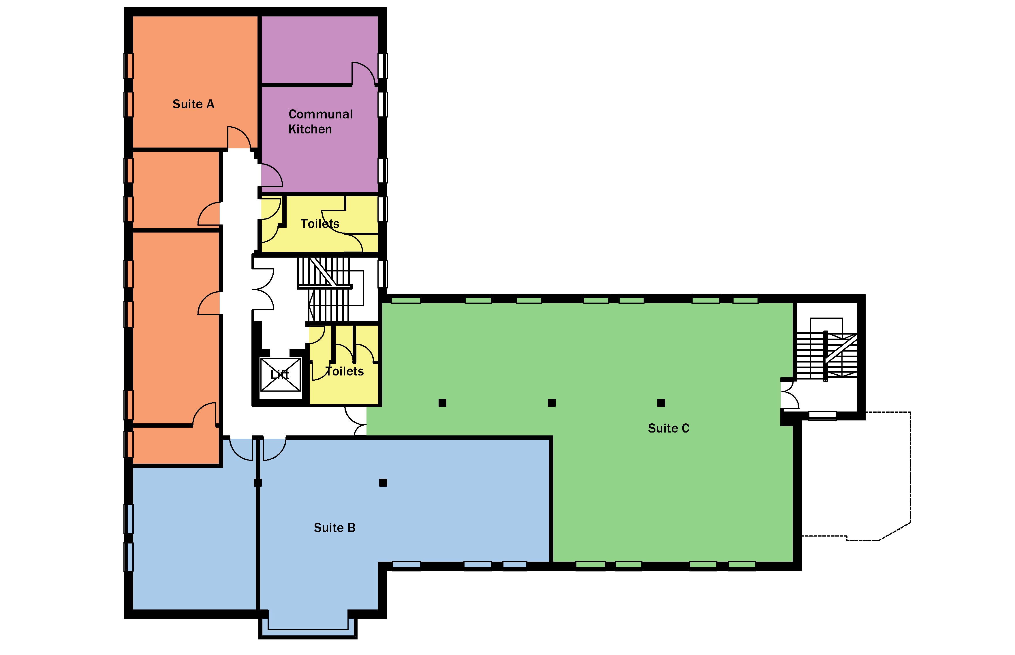 Additional features include a secure buzzer entry system, lift access to all floors, and a secure car park to the rear of the building. The accommodation is available either on a suite-by-suite basis or as a whole floor.