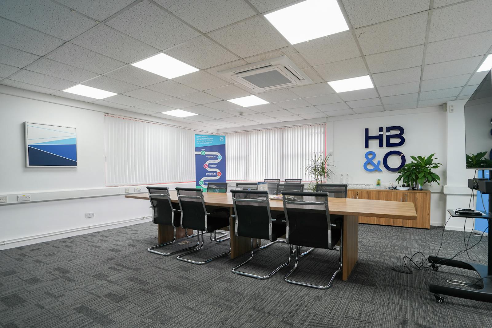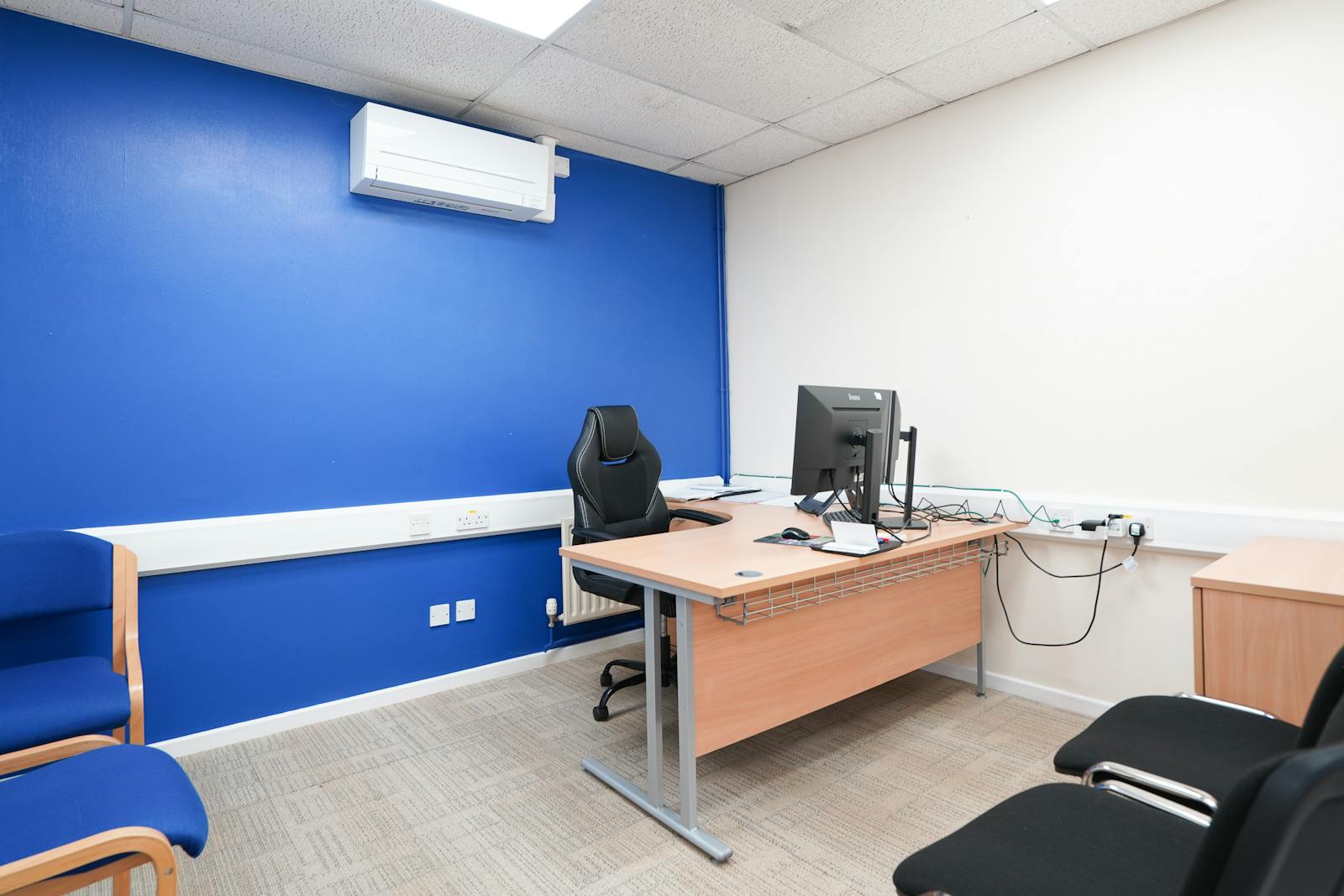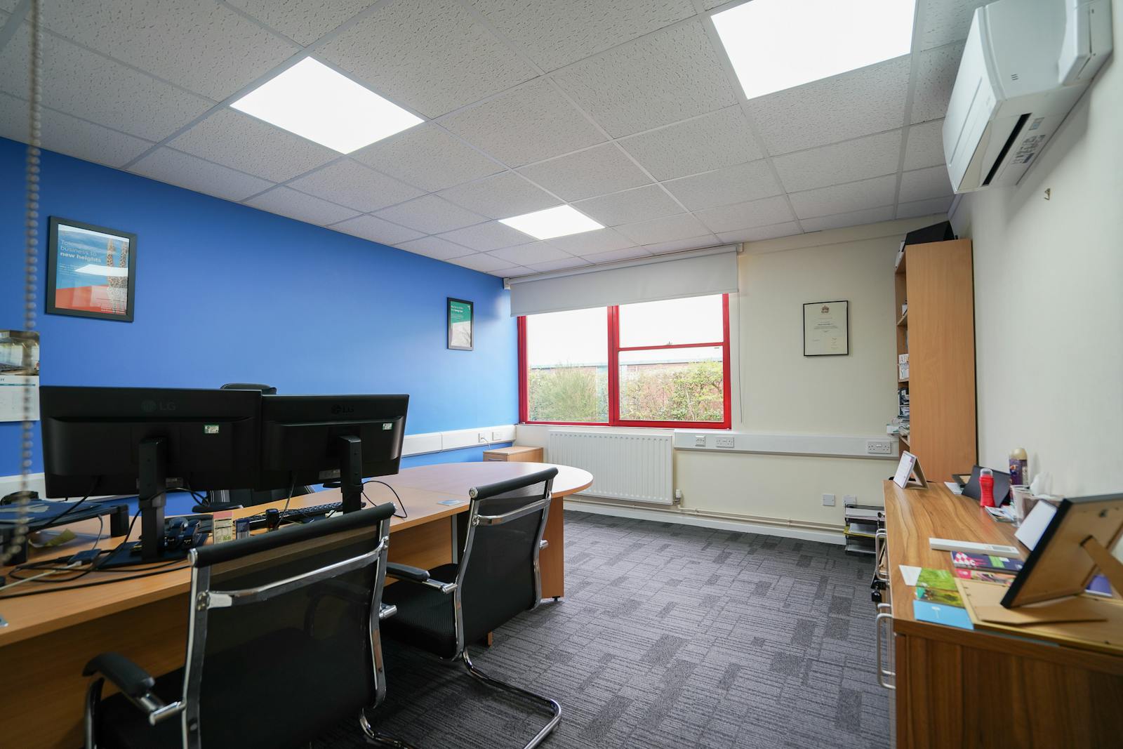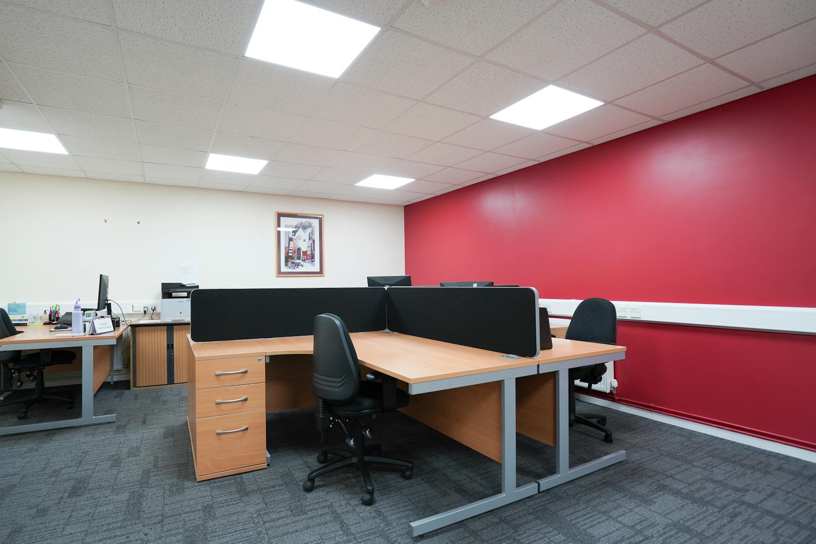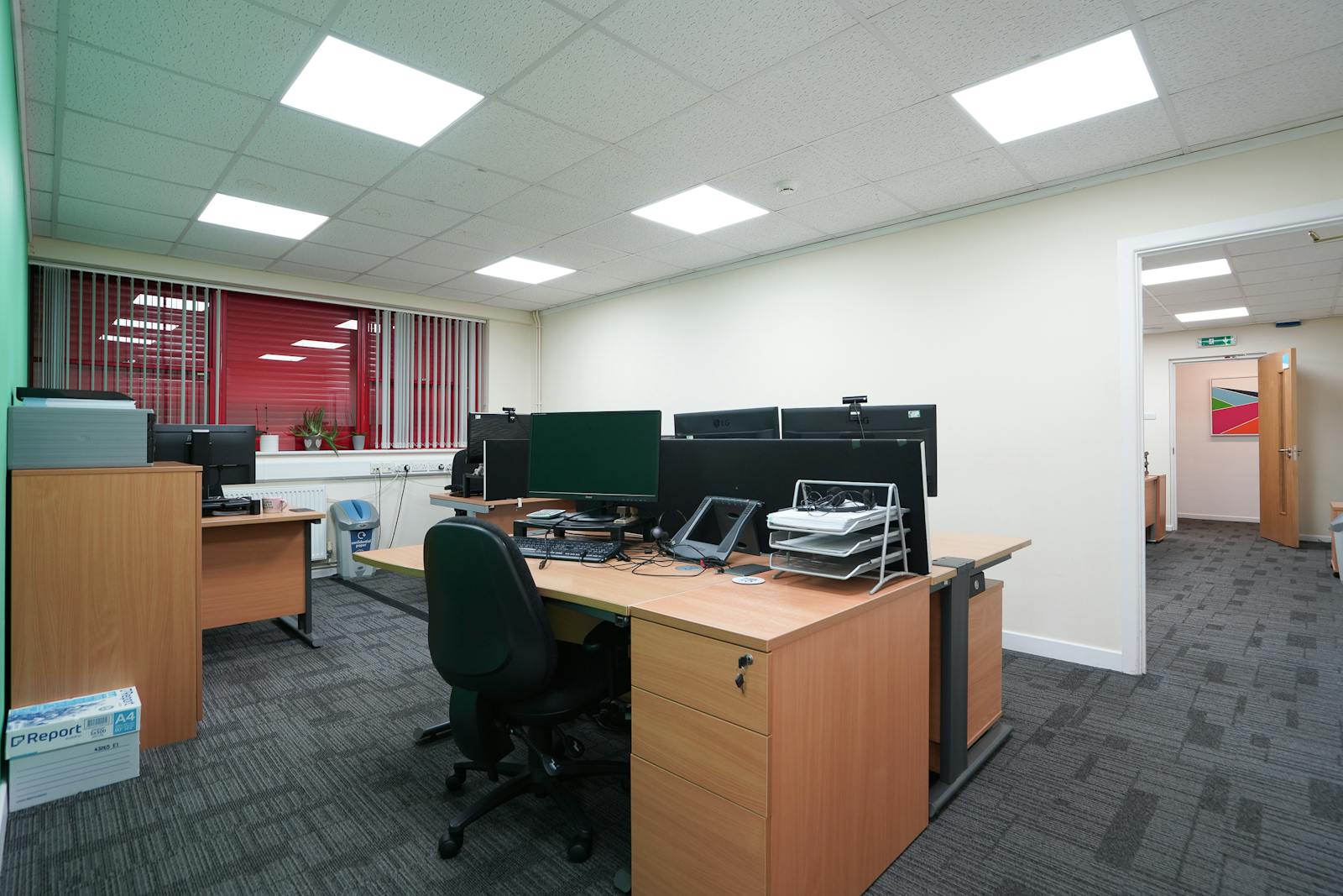 The specification includes carpet-tile floor coverings, neutral décor, dado-level perimeter trunking, suspended ceilings with integrated LED lighting, and air-conditioning, creating a comfortable and efficient working environment. The layout lends itself well to office, studio, or hybrid administrative uses.