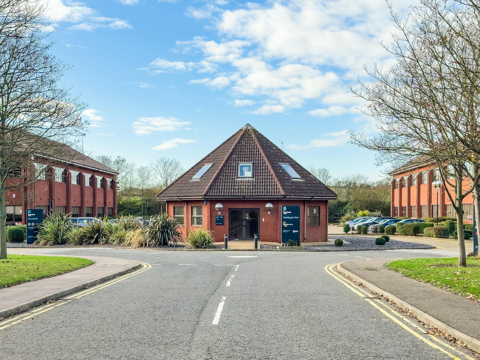 The Hub is a detached brick built office building in an octagonal configuration arranged over 2 storeys.