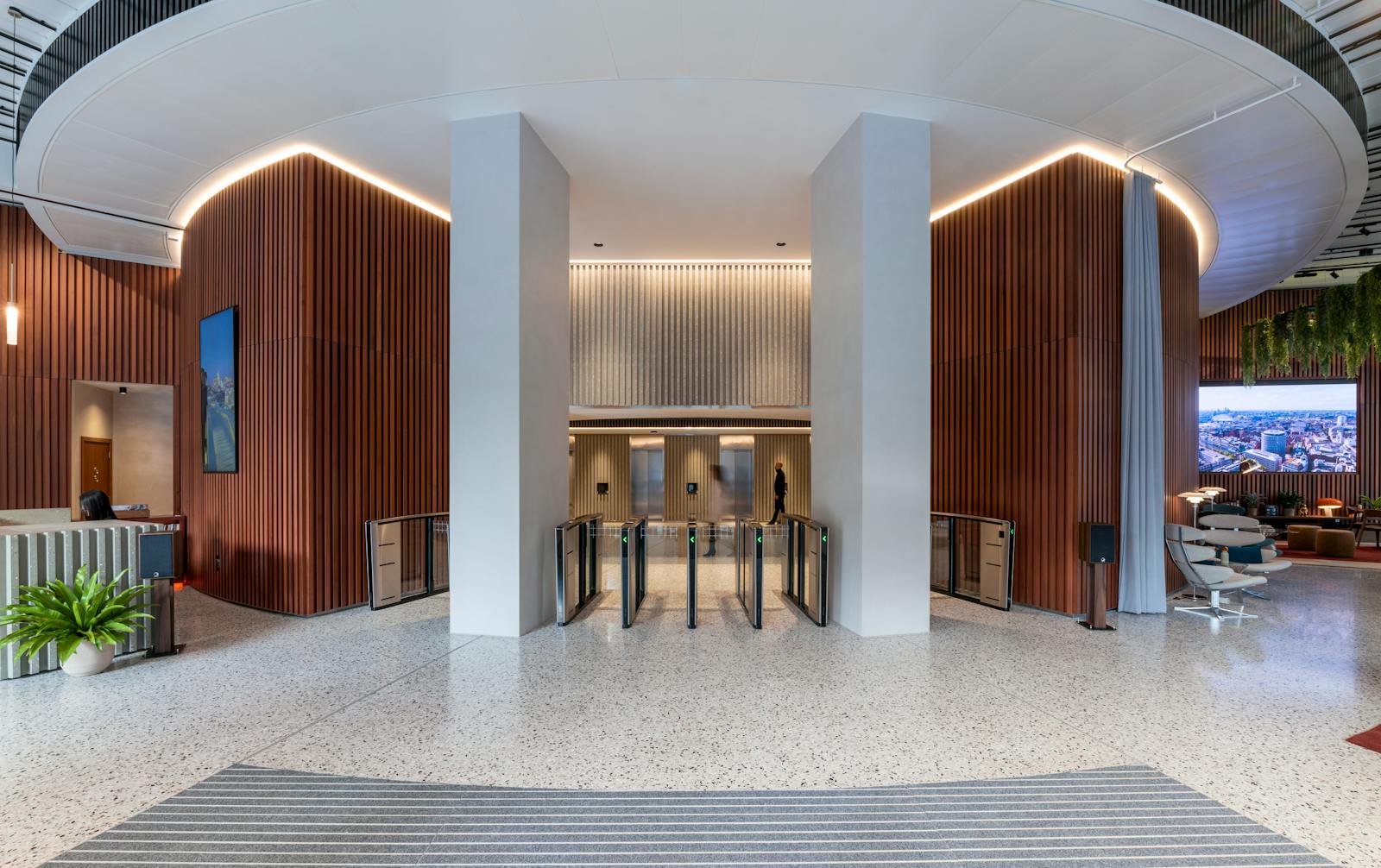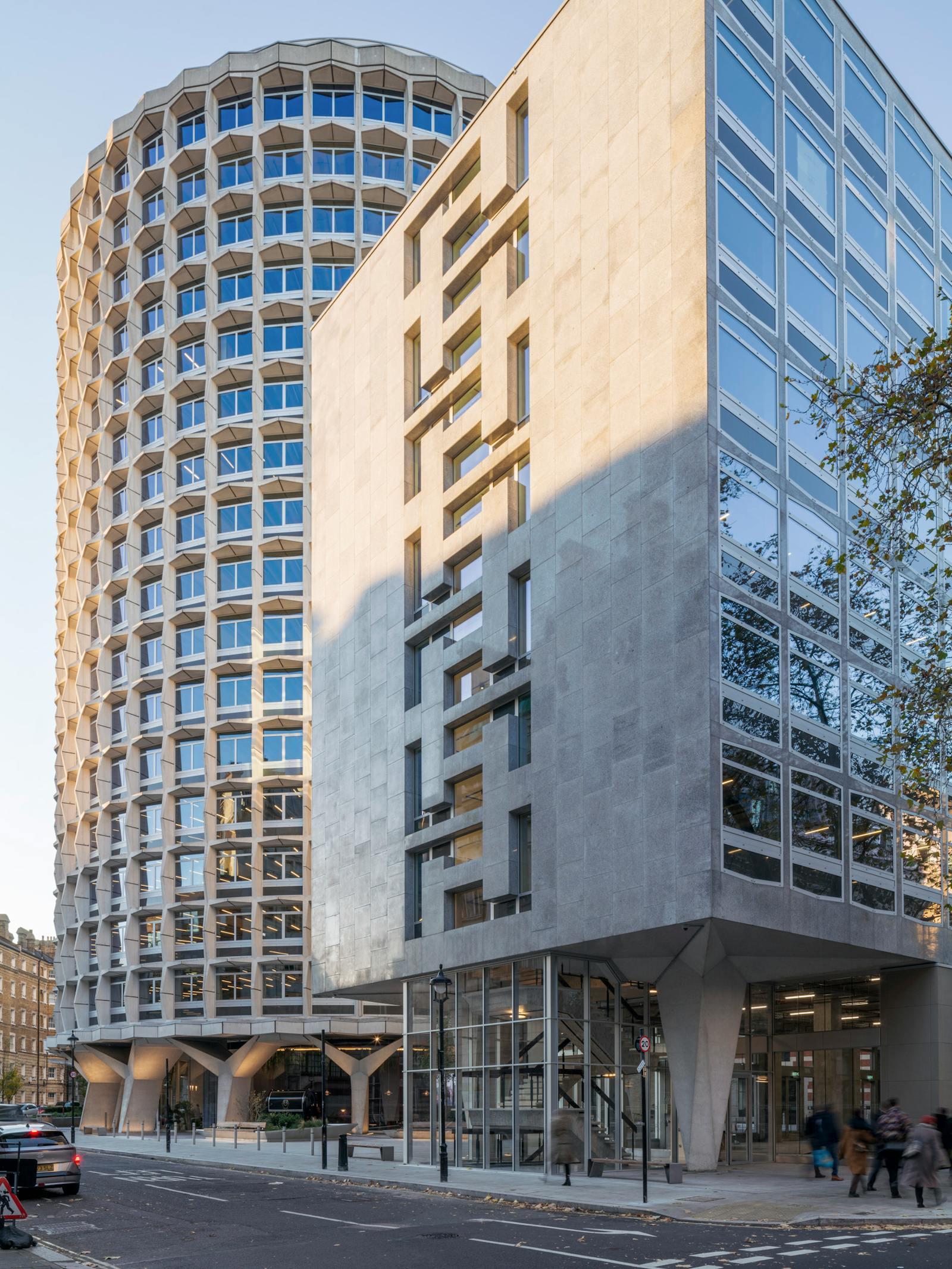 Comprising a striking cylindrical tower and adjoining rectangular block linked by a bridge, the building offers bright, light-filled offices, panoramic city views, private terraces and a range of shared amenity spaces.