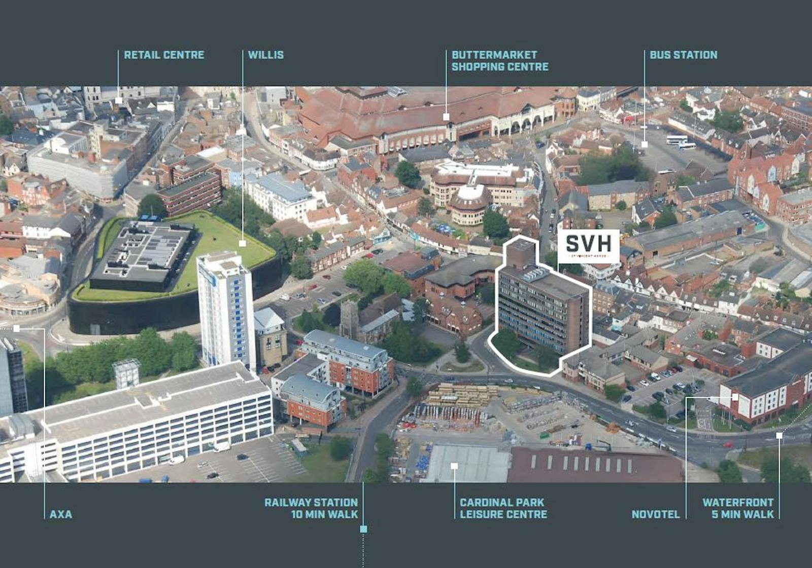 St Vincent House holds a strategic position equidistant from Ipswich waterfront with its marina and the main town centre. This location of St Nicholas / St Peter’s Street (the Saints Quarter) hosts a wealth of coffee shops, bars and restaurants, all on the building’s doorstep. Ipswich mainline railway station is approximately 0.5 mile away and there are a number of public car parks in the close vicinity.