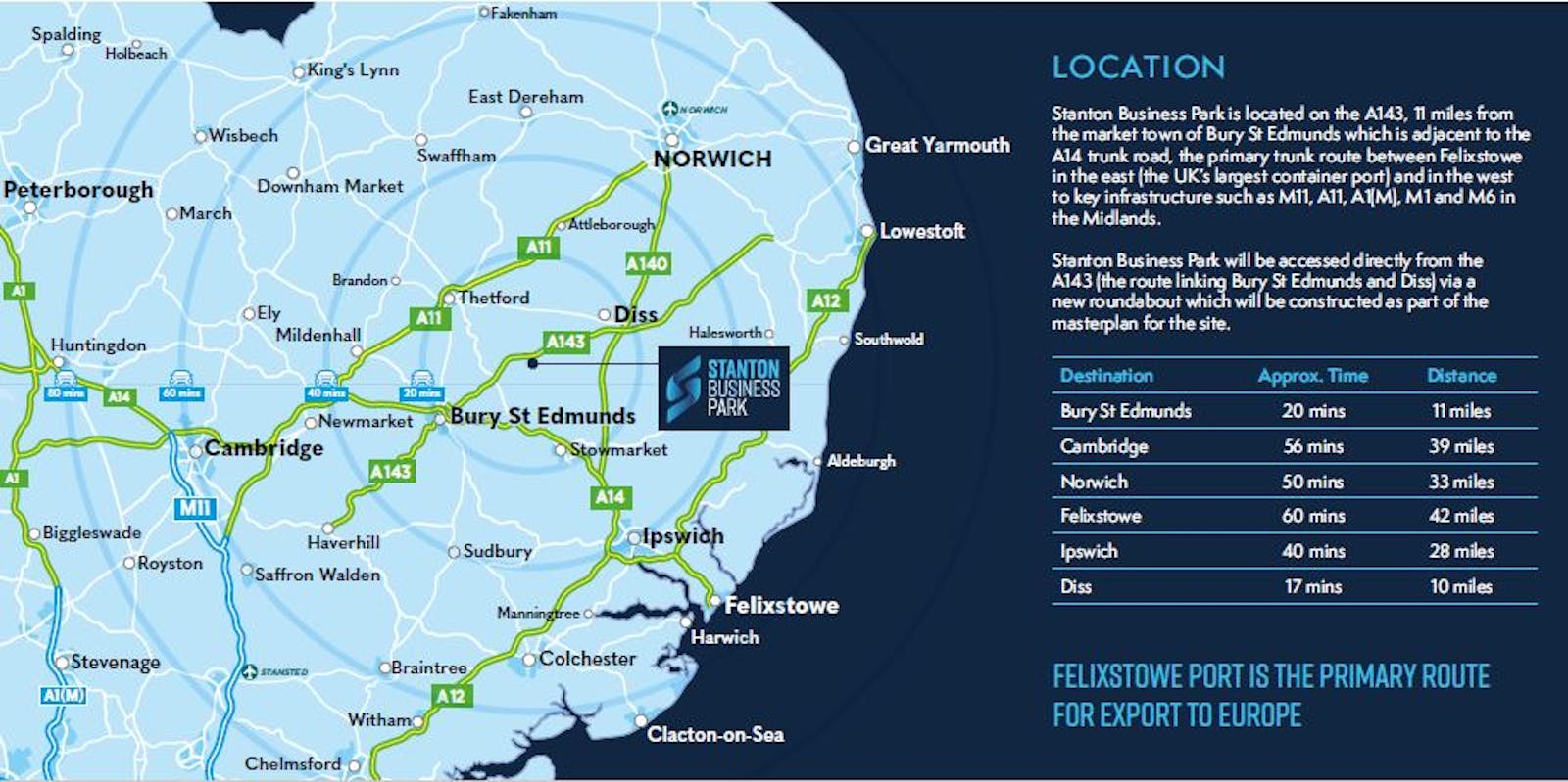Stanton Business Park is located on the A143, 11 miles from the market town of Bury St Edmunds which is adjacent to the A14 trunk road, the primary trunk route between Felixstowe in the east (the UK’s largest container port) and in the west to key infrastructure such as M11, A11, A1(M), M1 and M6 in the Midlands.