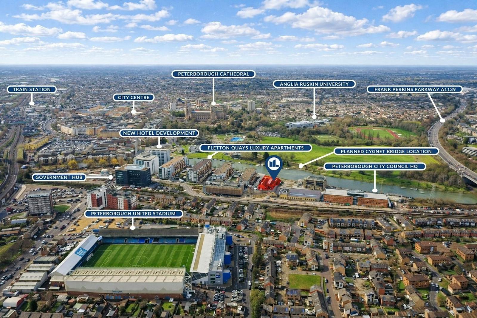 In 2026, the Council began work on the Cygnet Bridge, which will provide a sustainable travel connection across the River Nene between the Embankment, Fletton Quays and the city centre. The bridge will land within the footprint of the property, providing exceptional pedestrian footfall opportunities. The bridge will offer pedestrians and cyclists an alternative route across the river, away from the busy main road. It will create a strong link from the south of the city to the new university campus. ARU Peterborough is a new £30 million university for Peterborough that opened in September 2022 and now hosts 2,000 students. This number is expected to grow to 12,500 by 2030 as the university expands. Next to the university will be the proposed new leisure centre, which is expected to be delivered in 2028.
