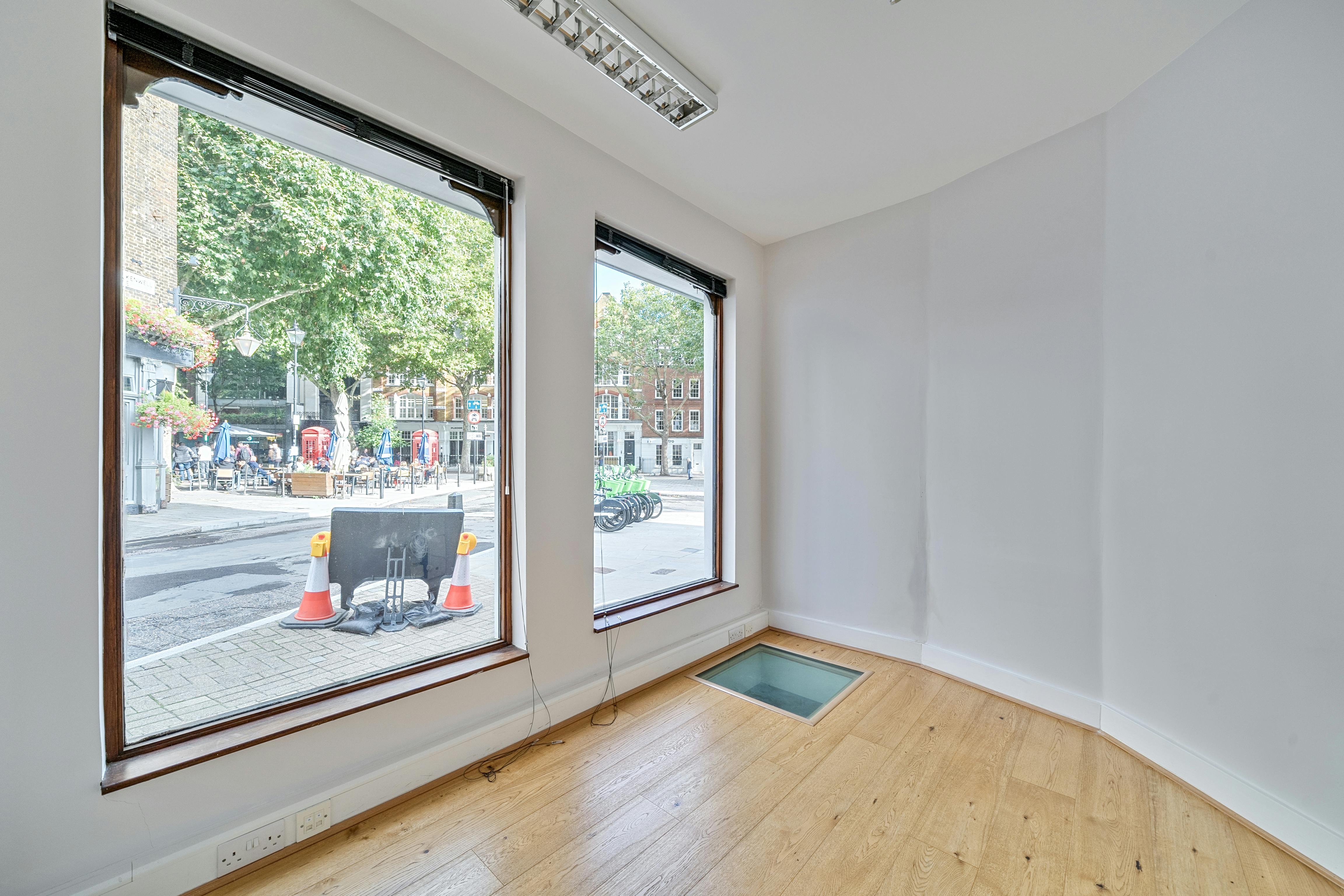 This property is a detached Edwardian brick building offering commercial accommodation across the ground and lower-ground floors. The ground floor features an open-plan showroom with extensive street frontage.