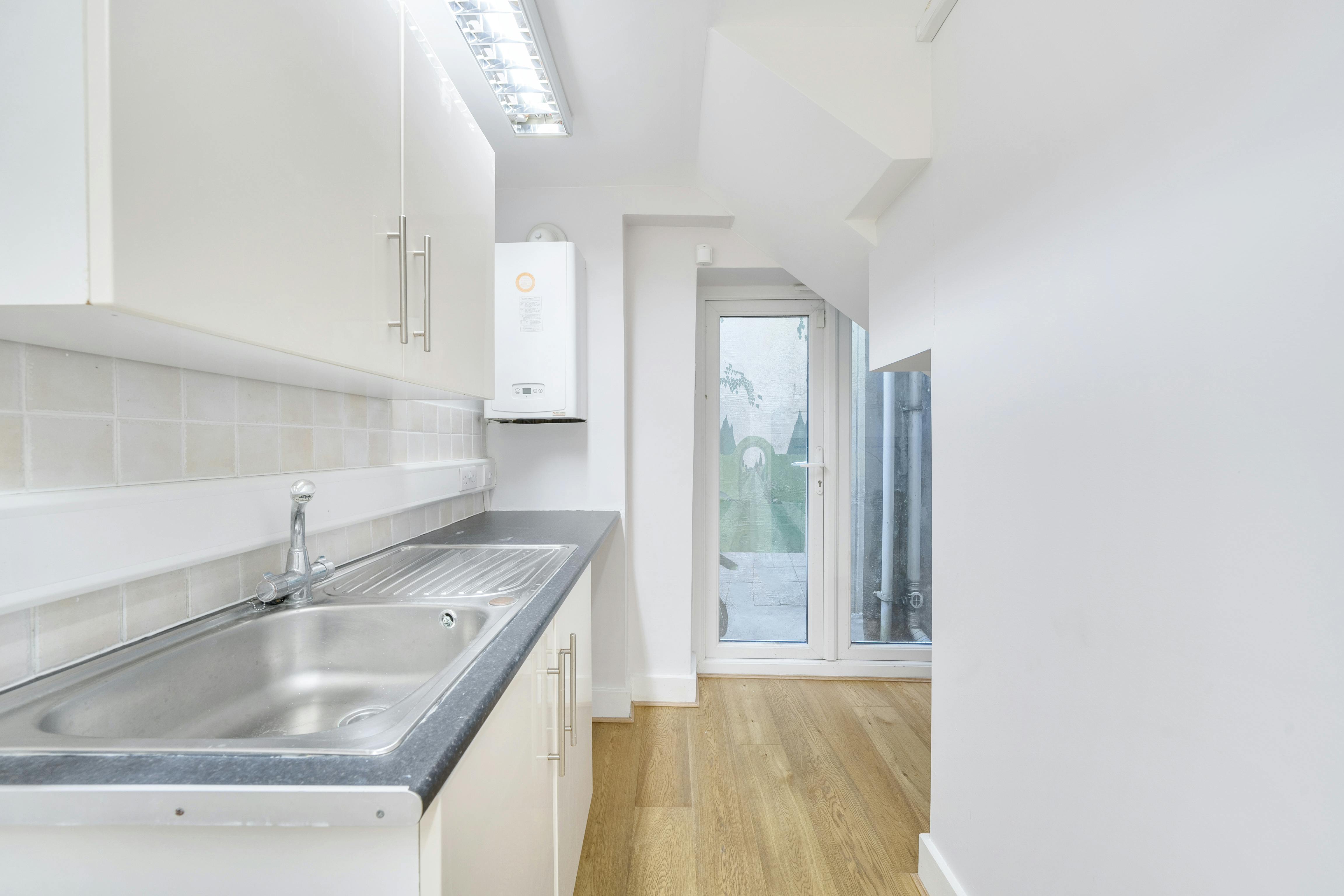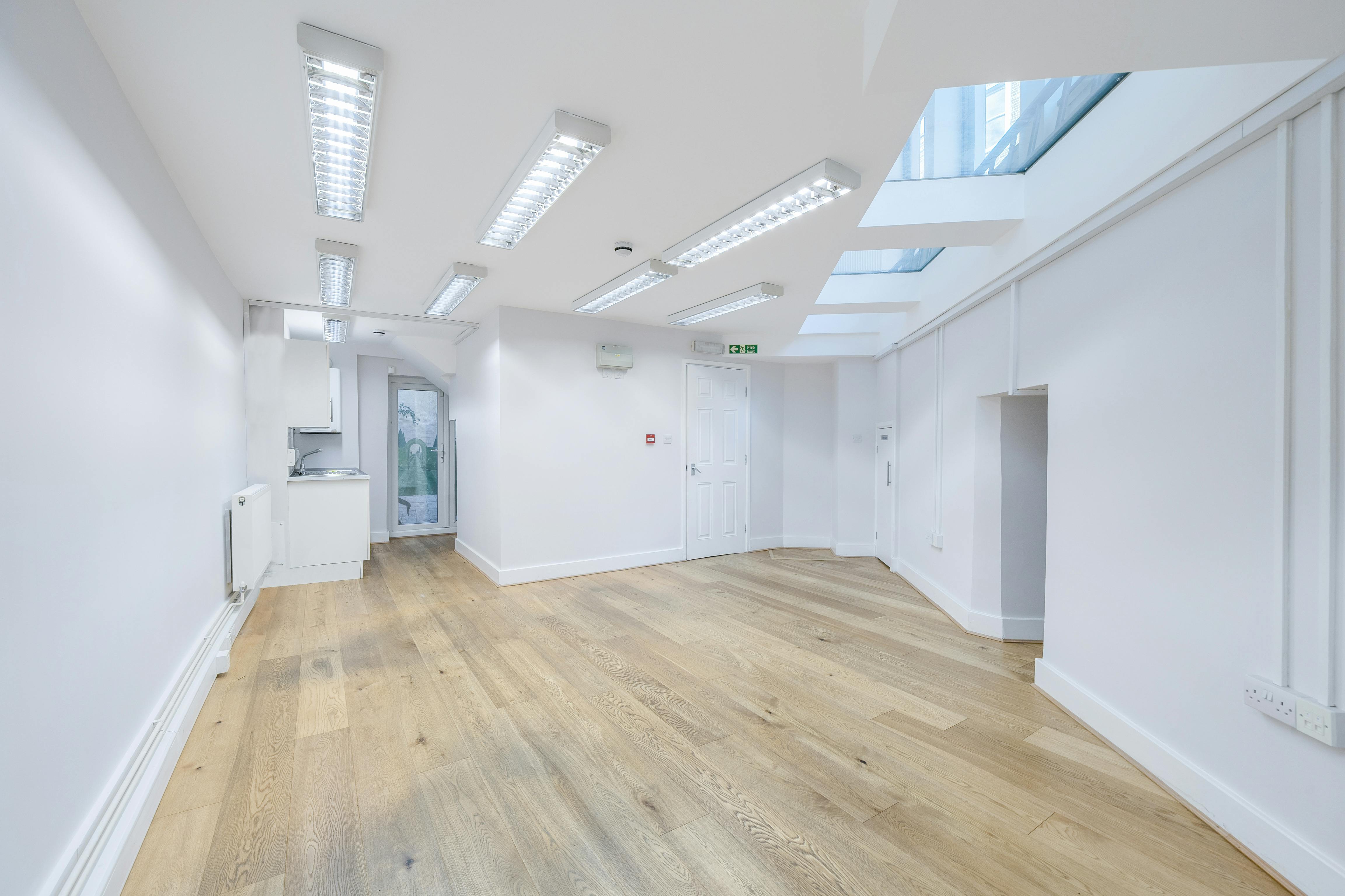 The building benefits from central heating, generous ceiling heights, a fitted kitchenette, and male and female WCs. The lower-ground floor receives natural light through a kitchenette French window and a lightwell with attractive wall mural, and includes a private office.