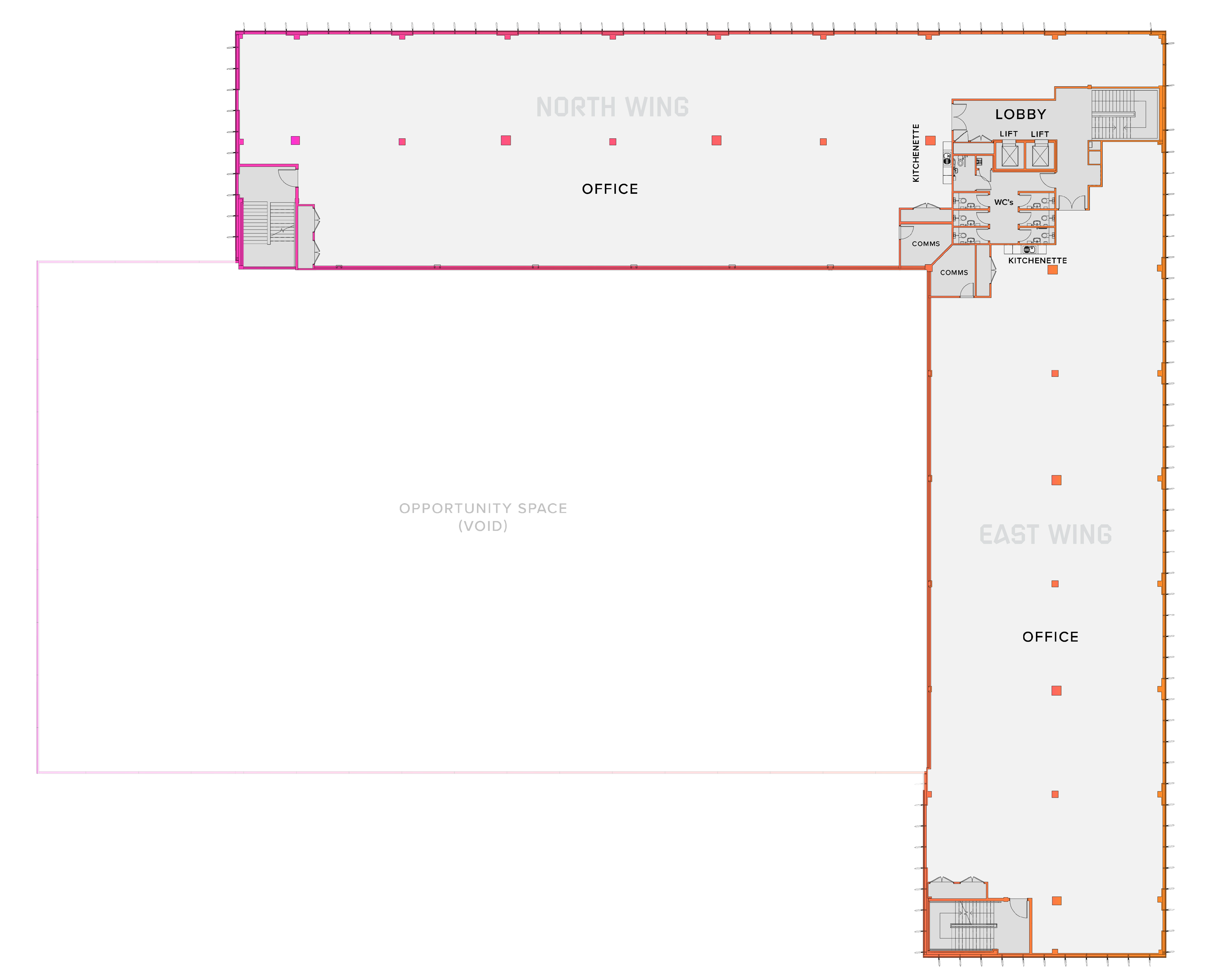 Flexible floorplates facilitating occupation in entirety, on a floor-by-floor or up to 8 wing-by-wing bases.