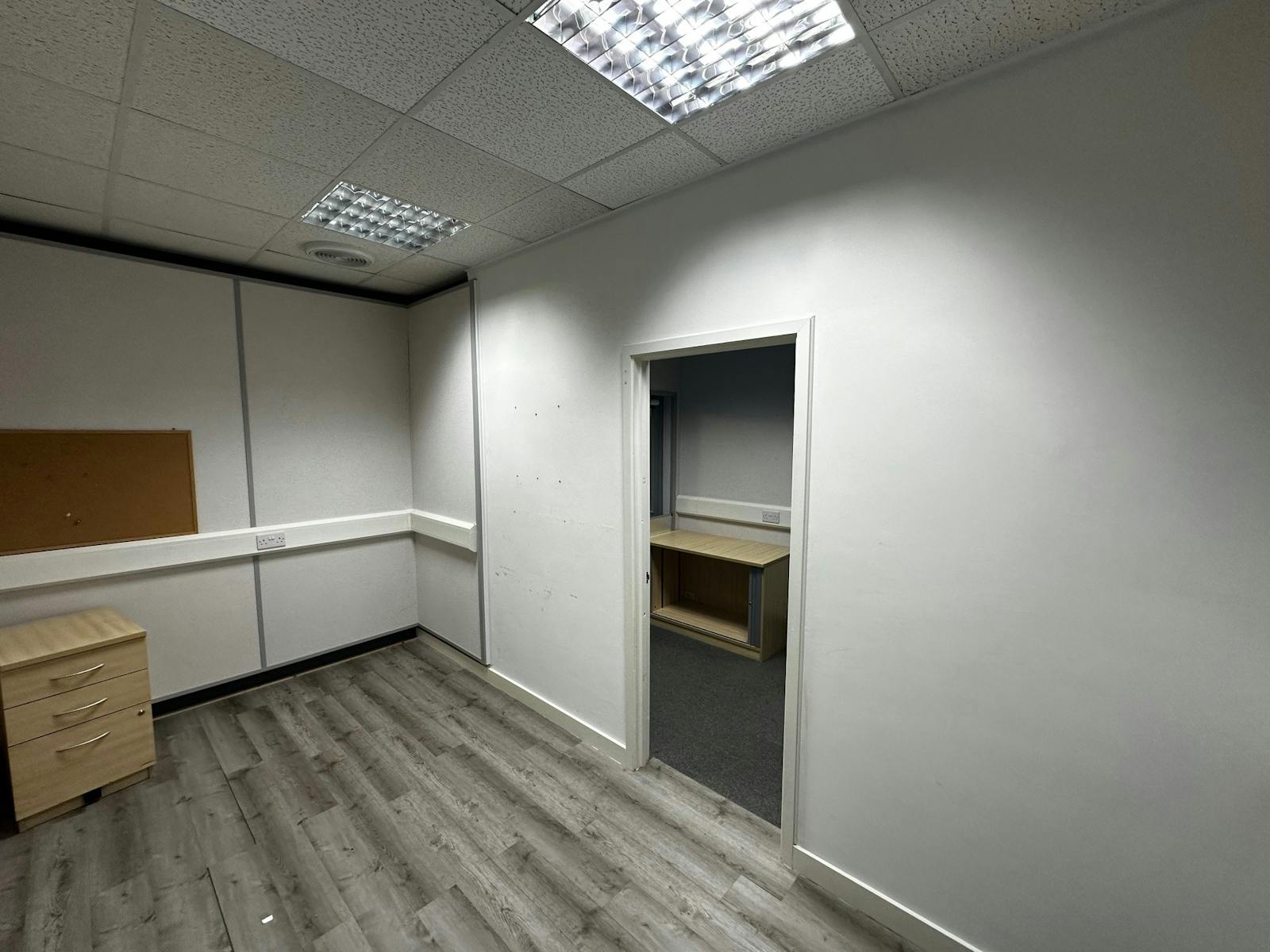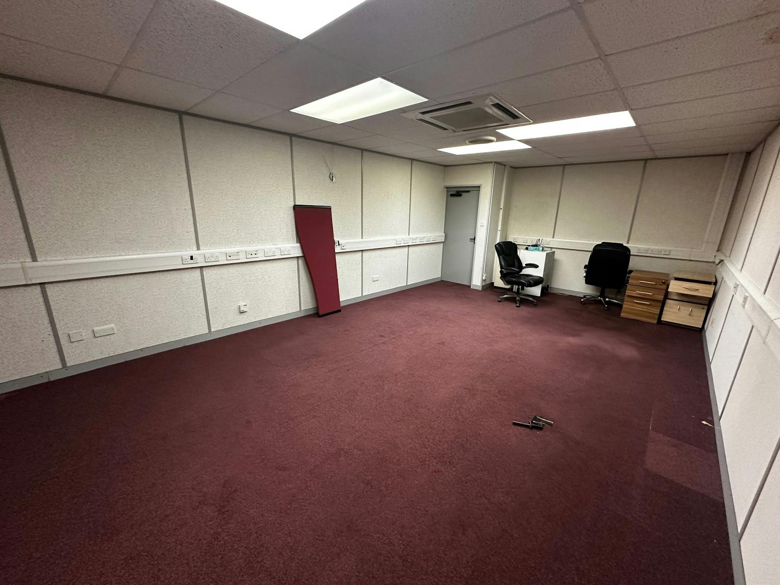 Solid floors with carpet or laminate covering, suspended ceilings with fluorescent lighting and three compartment trunking for IT, telecoms and electric.