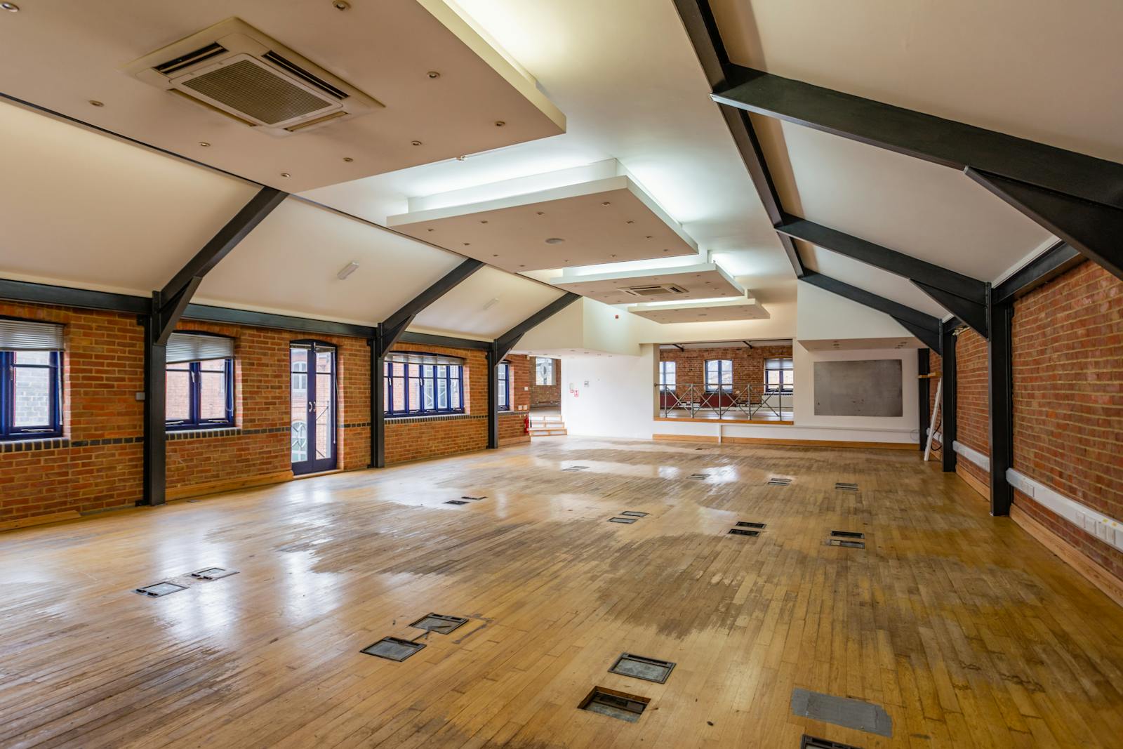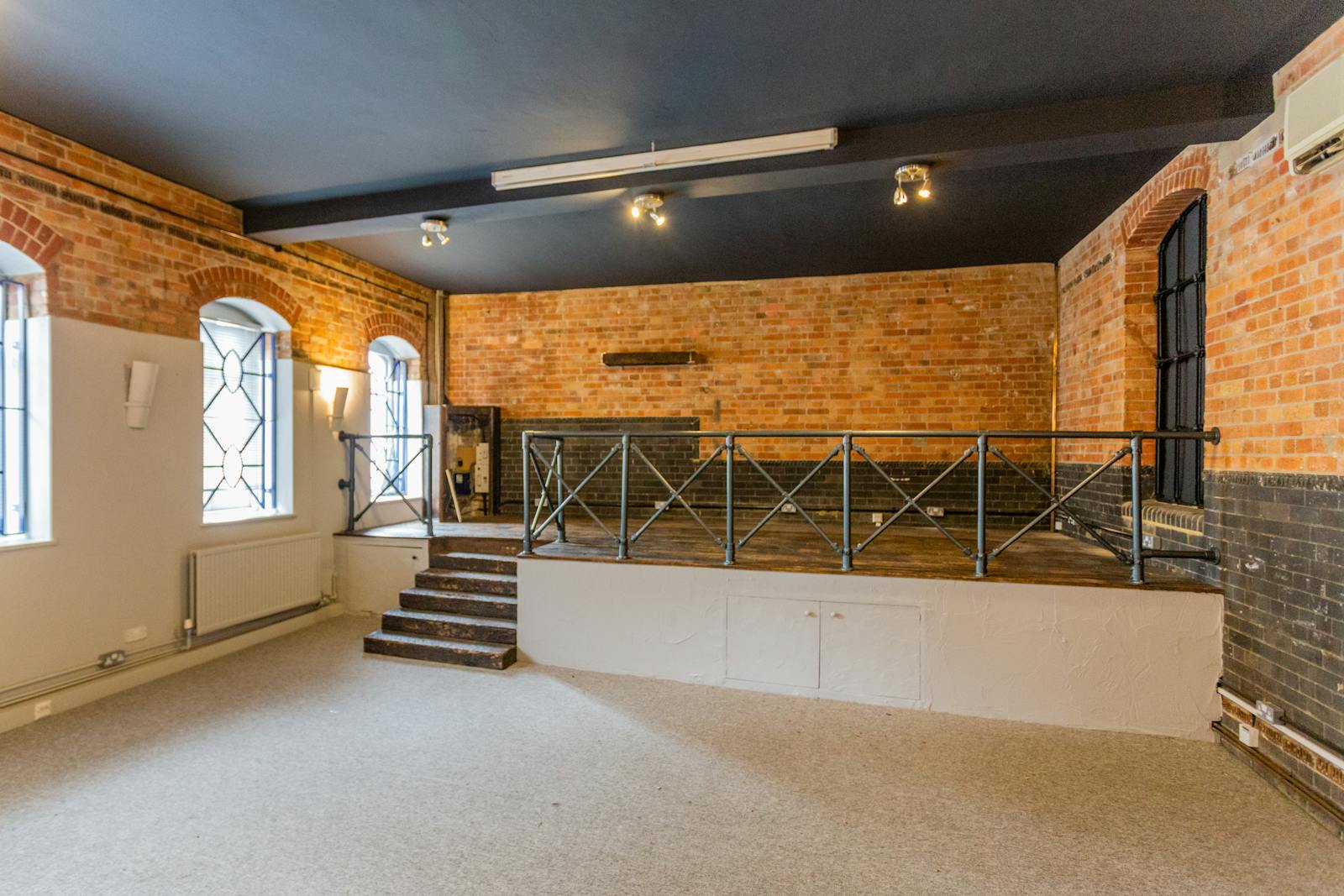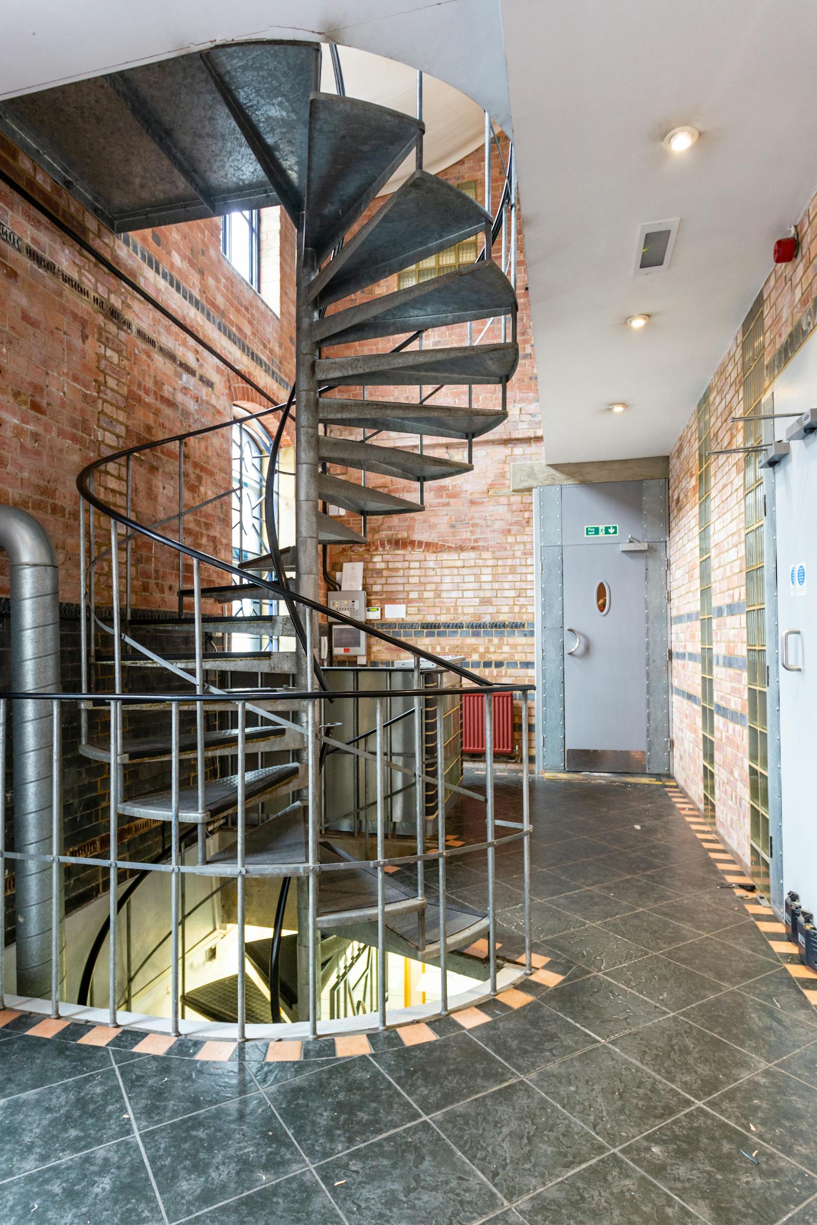 The Old Brewery is a charming, characterful office building with a blend of original period features and modern amenities. Arranged over basement, ground, and first floors, the property offers a combination of open-plan and cellular office accommodation. The building’s rich history as a former brewery is reflected in its exposed brickwork, large feature windows, and a striking spiral staircase leading to a gallery-style landing. The ground-floor reception boasts stone tile flooring, a brass feature door, and decorative window detailing, creating an inviting entrance.