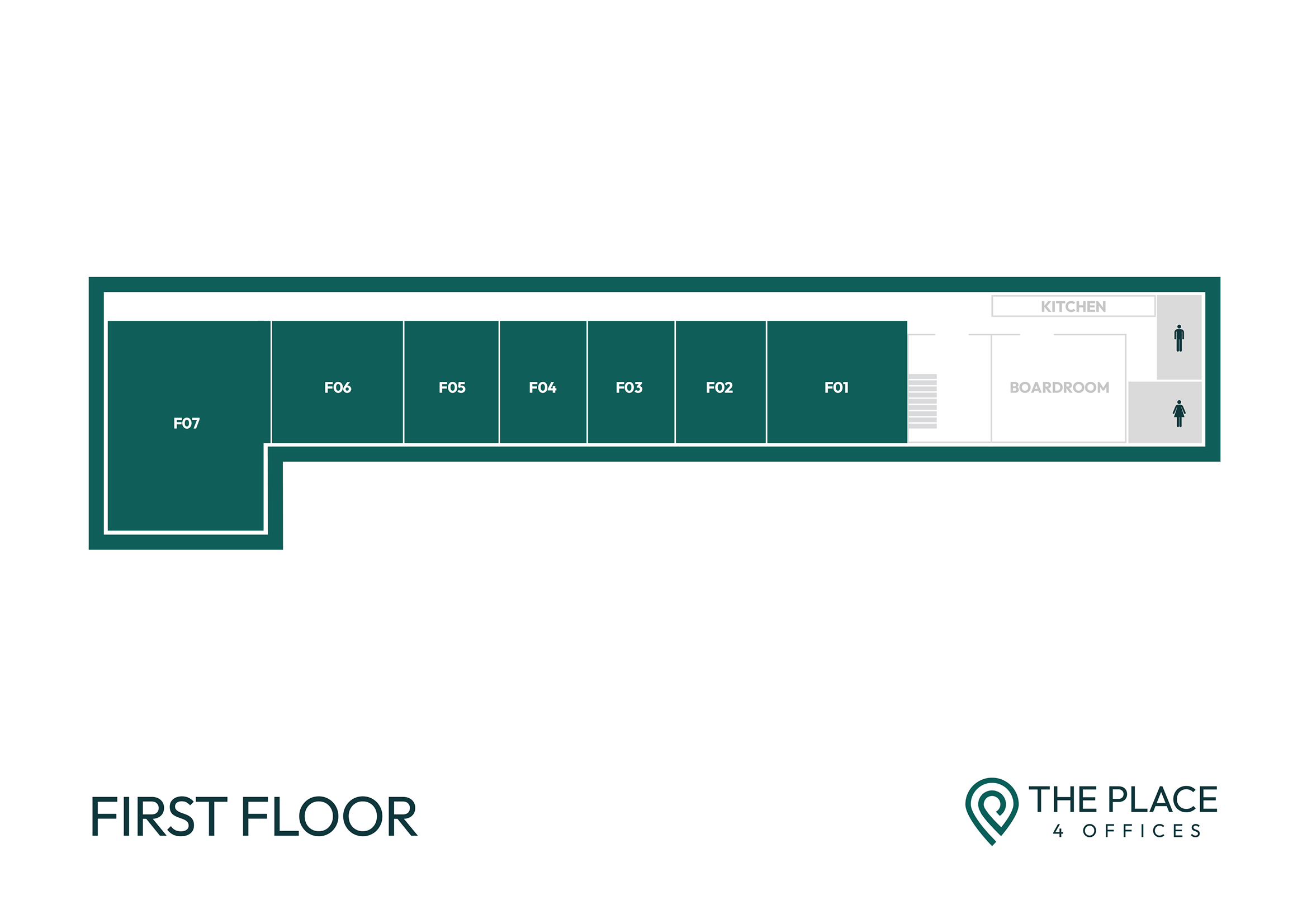 The first-floor accommodation offers an additional 7 individual offices also with shared male and female W.Cs and a fully fitted kitchen. There is also an eight-person boardroom on the first floor which is available to rent.